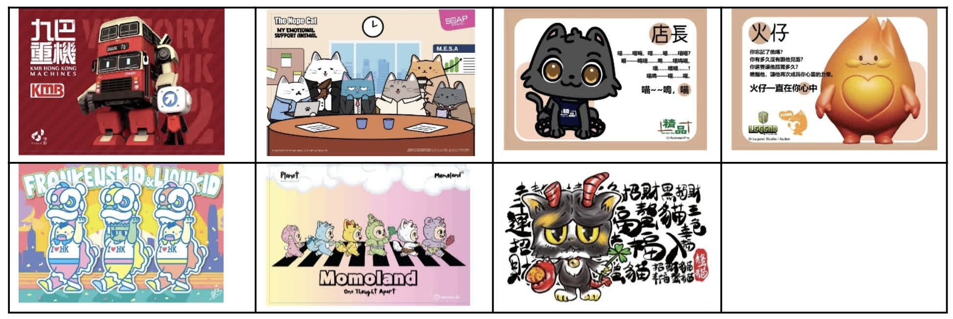欣賞展品之餘,只要集齊七款IP公仔印花,即可換領全套七款全新原創IP主題明信片,包括:Frankenskid、Omeow螯貓、九巴重機、The Nope Cat、火仔、UNI@MOMOLAND及貓店長「初音」,玩具迷切勿錯過!