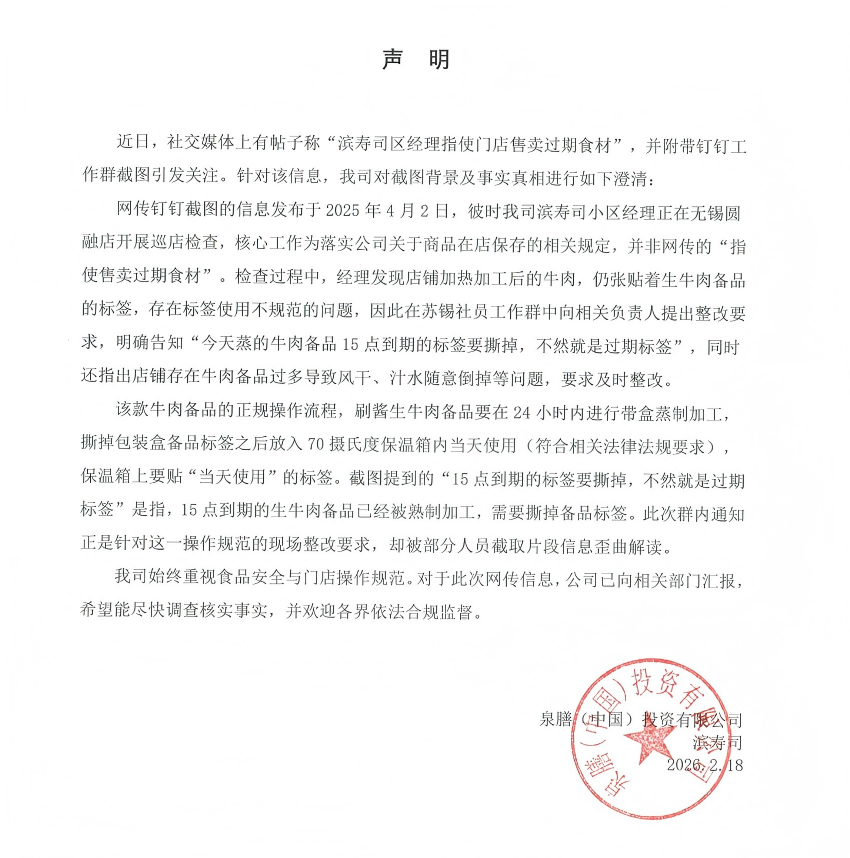 泉膳(中国)投资有限公司表示,公司始终重视食品安全与门店操作规范。对于此次网传信息,公司已向相关部门汇报,希望能尽快调查核实事实,并欢迎各界依法合规监督。