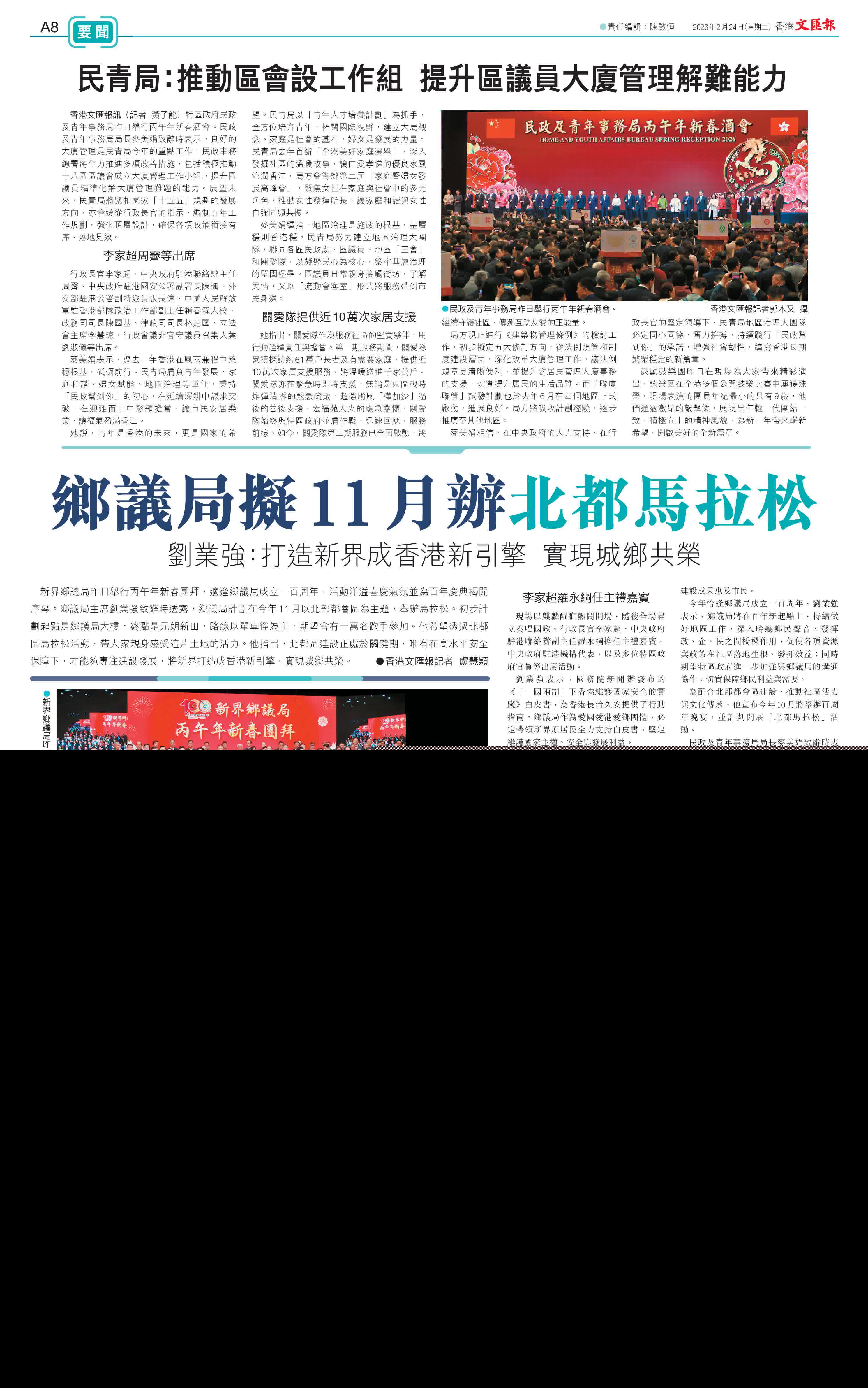 (香港文匯報記者 盧慧穎)新界鄉議局昨日舉行丙午年新春團拜,適逢鄉議局成立一百周年,活動洋溢喜慶氣氛並為百年慶典揭開序幕。鄉議局主席劉業強致辭時透露,鄉議局計劃在今年11月以北部都會區為主題,舉辦馬拉松。初步計劃起點是鄉議局大樓,終點是元朗新田,路線以單車徑為主,期望會有一萬名跑手參加。他希望透過北都區馬拉松活動,帶大家親身感受這片土地的活力。他指出,北都區建設正處於關鍵期,唯有在高水平安全保障下,才能夠專注建設發展,將新界打造成香港新引擎,實現城鄉共榮。