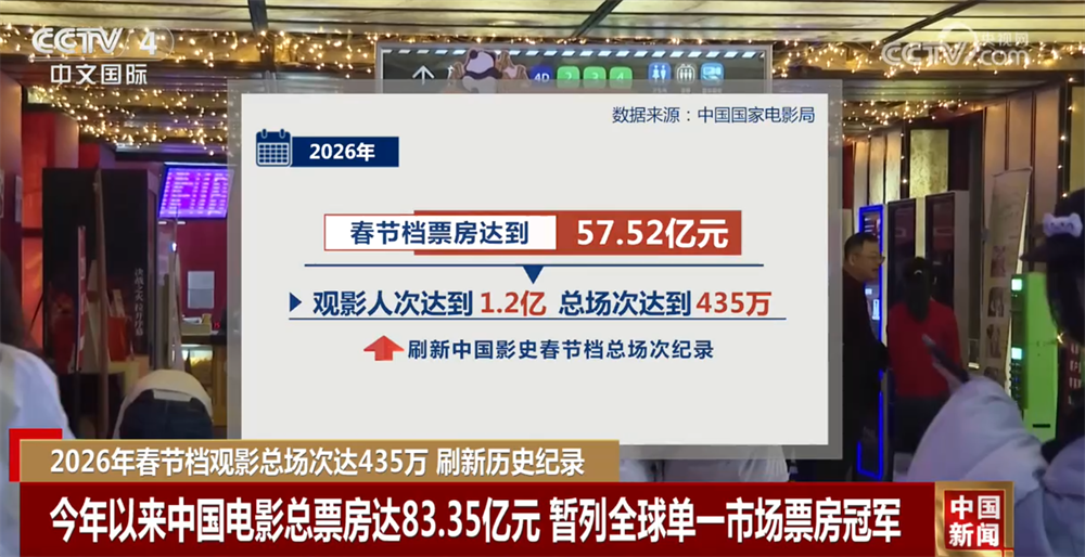 中国国家电影局数据显示,2026年春节档票房达到57.52亿元,观影人次达到1.2亿,总场次达到435万,刷新中国影史春节档总场次纪录,助推今年以来中国电影总票房达到83.35亿元,超过北美市场,暂列全球单一市场票房冠军。