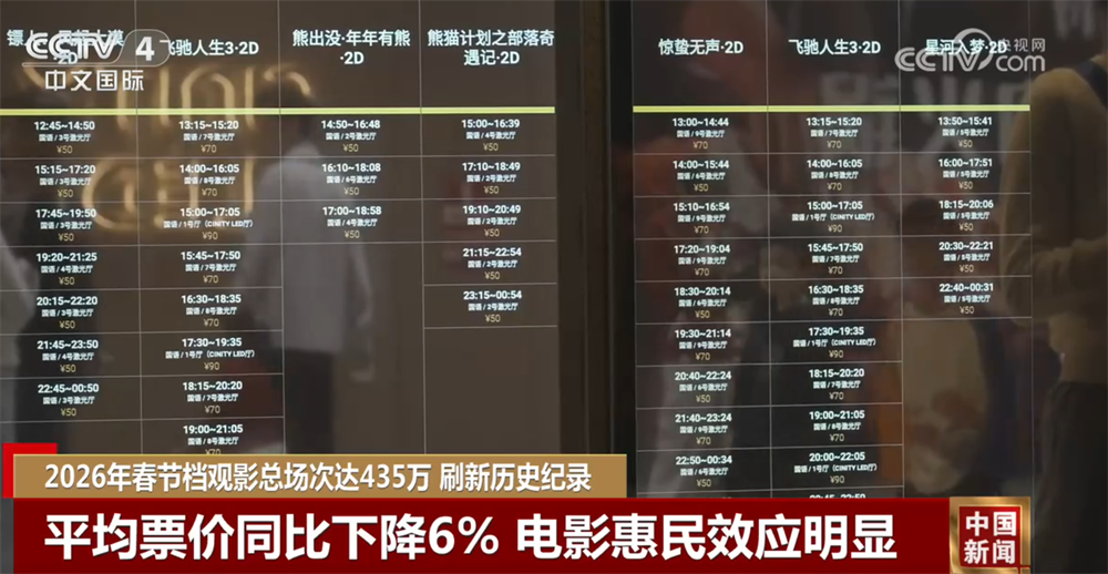 央视网消息:今年春节期间,多部题材丰富、类型各异的国产新片大片齐聚银幕,满足了不同地域、全年龄层、多元化的观影需求。中国国家电影局24日发布统计数据,2026年春节档观影总场次达到435万,刷新中国影史春节档总场次纪录。
