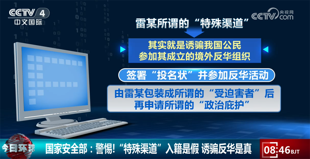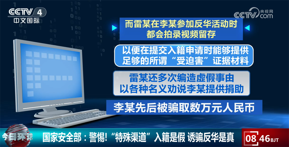 雷某所谓的“特殊渠道”其实就是诱骗我国公民参加其成立的境外反华组织,签署“投名状”并参加反华活动,由雷某包装成所谓的“受迫害者”后再申请所谓的“政治庇护”。而雷某在李某参加反华活动时都会拍录视频留存,以便在提交入籍申请时能够提供足够的所谓“受迫害”证据材料。同时,雷某还多次编造虚假事由,以各种名义劝说李某提供捐助,李某先后被骗取数万元人民币。