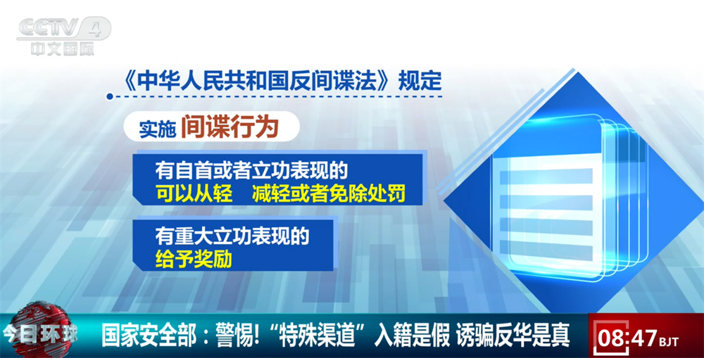 国家安全机关提示,《中华人民共和国反间谍法》规定,实施间谍行为,有自首或者立功表现的,可以从轻、减轻或者免除处罚;有重大立功表现的,给予奖励。在境外受胁迫或者受诱骗参加间谍组织、敌对组织,从事危害中华人民共和国国家安全的活动,及时向中华人民共和国驻外机构如实说明情况,或者入境后直接或通过所在单位及时向国家安全机关如实说明情况,并有悔改表现的,可以不予追究。