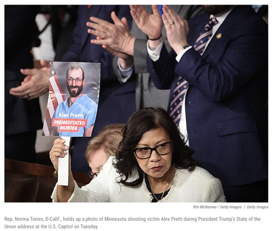 △在国情咨文演讲现场,加州民主党众议员诺玛·托雷斯举起上月移民执法行动中被击毙的普雷蒂照片