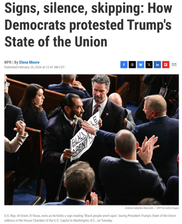 现场最突出的插曲,是德州民主党众议员阿尔·格林在开场时举起“黑人不是猿”(Black people aren't apes)的标语,随即被工作人员带离会场。这一标语直接指向特朗普此前在社交媒体上分享、后又删除的一段争议视频(将奥巴马夫妇描绘成猿类形象)。格林称其为“种族主义”“令人作呕”,并表示自己刻意选择该站位,就是要在全国直播中当面让特朗普看到抗议。短短几十秒的“标语—安保介入—被带离”画面,明显冲击了会场的原本节奏,把场内矛盾从“沉默抵制”推向了“公开对抗”。