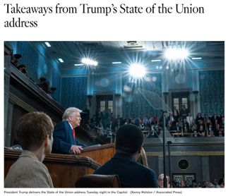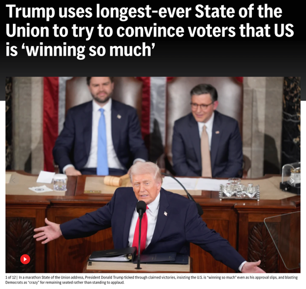 △美联社报道,特朗普发表史上最长的国情咨文演讲,试图令选民信服美国正在取得巨大胜利