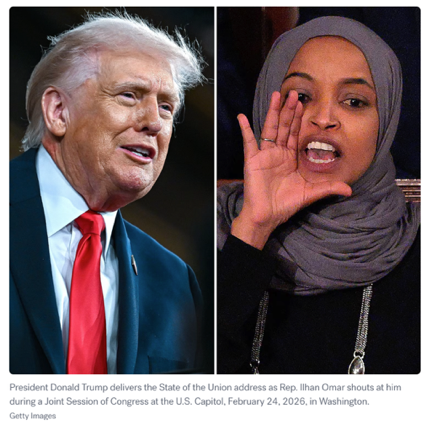 △当天,特朗普在国情咨文演讲中谈到移民执法时,来自明尼苏达州的民主党众议员奥马尔对特朗普高声指责