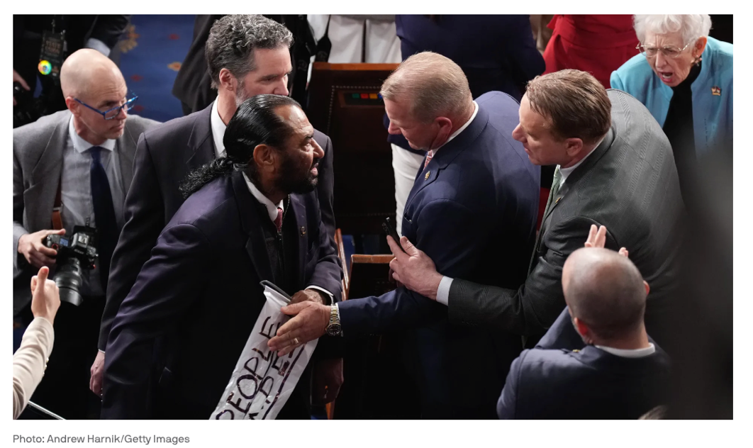 如果说举牌抗议还主要停留在视觉层面,那么第三层对抗,则是声音直接闯入:议员不再只用缺席、沉默或标语表达态度,而是当场打断总统讲话,把国情咨文硬生生拉入冲突。