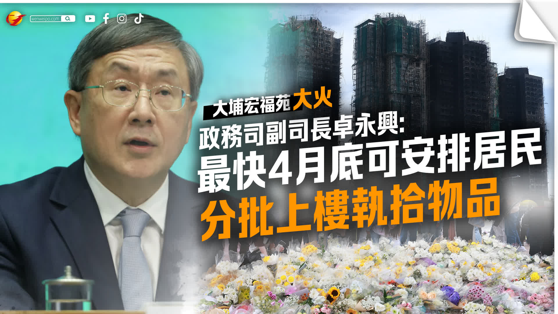香港文匯報訊(記者 蕭景源)大埔宏福苑發生五級火警至今3個月,「緊急支援及募捐工作組」組長、政務司副司長卓永興今日(27日)在電台節目中表示,現時正安排在安全情況下,讓7座受大火波及樓宇的居民,返回單位執拾物品,初步預料最快4月底可安排分批上樓,爭取下月公布詳情。
