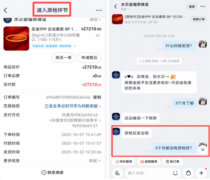 打开“人民投诉”,类似的订单“烂尾”故事不在少数。广州的罗先生在抖音平台购买近两万元黄金手镯,订单在金价上涨后同样陷入“虚假发货”状态。他向质检中心求证,对方称收到的是空包裹。“金价跌了就正常发,涨了就玩消失,这不是商业诚信问题,而是赤裸裸的欺诈。”罗先生愤慨道。