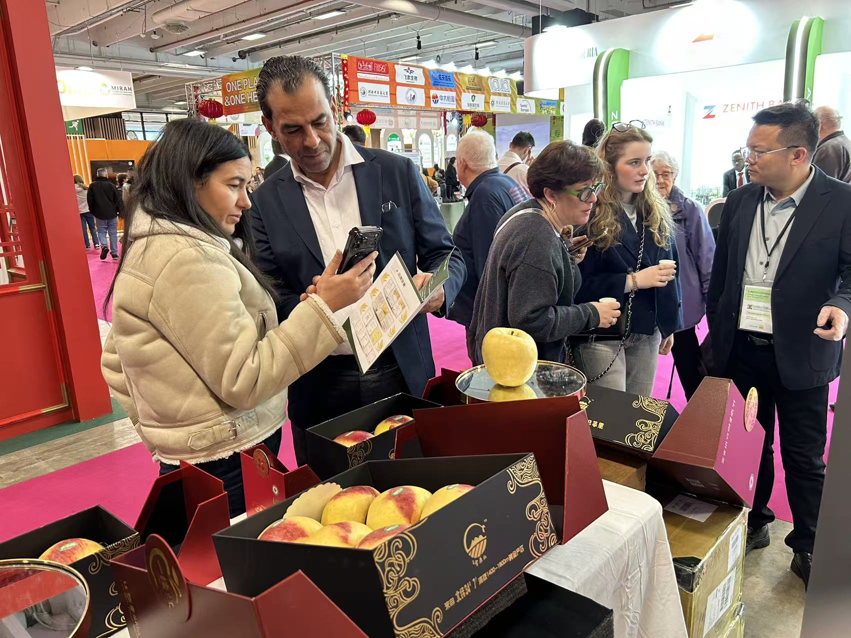 在中国馆展台前,精美礼盒中整齐陈列的甘谷苹果散发着诱人光泽,成为展区内一道亮眼的风景线。现场,来自中国的新农人手持苹果,向到场的法国农业从业者、采购商及普通观众详细推介这款来自黄土高原的佳果:“我们的苹果生长在海拔1300至1800米的黄土高原,这里的黄绵土富含钙质,七项关键生长指标中有六项达到最优标准。全程按照有机标准种植,不使用化学杀虫剂,每一颗都是自然的馈赠。”外国友人们纷纷手捧苹果端详、拍照留念,参展商专注聆听产品介绍,不少国际消费者当场品尝后竖起大拇指,对甘谷苹果的口感给予高度认可。这场展示,不仅亮出了一款优质水果,更传递出中国农业从“量的积累”向“质的飞跃”转型的坚定步伐,彰显了中国农产品在国际市场上日益增强的品牌竞争力。