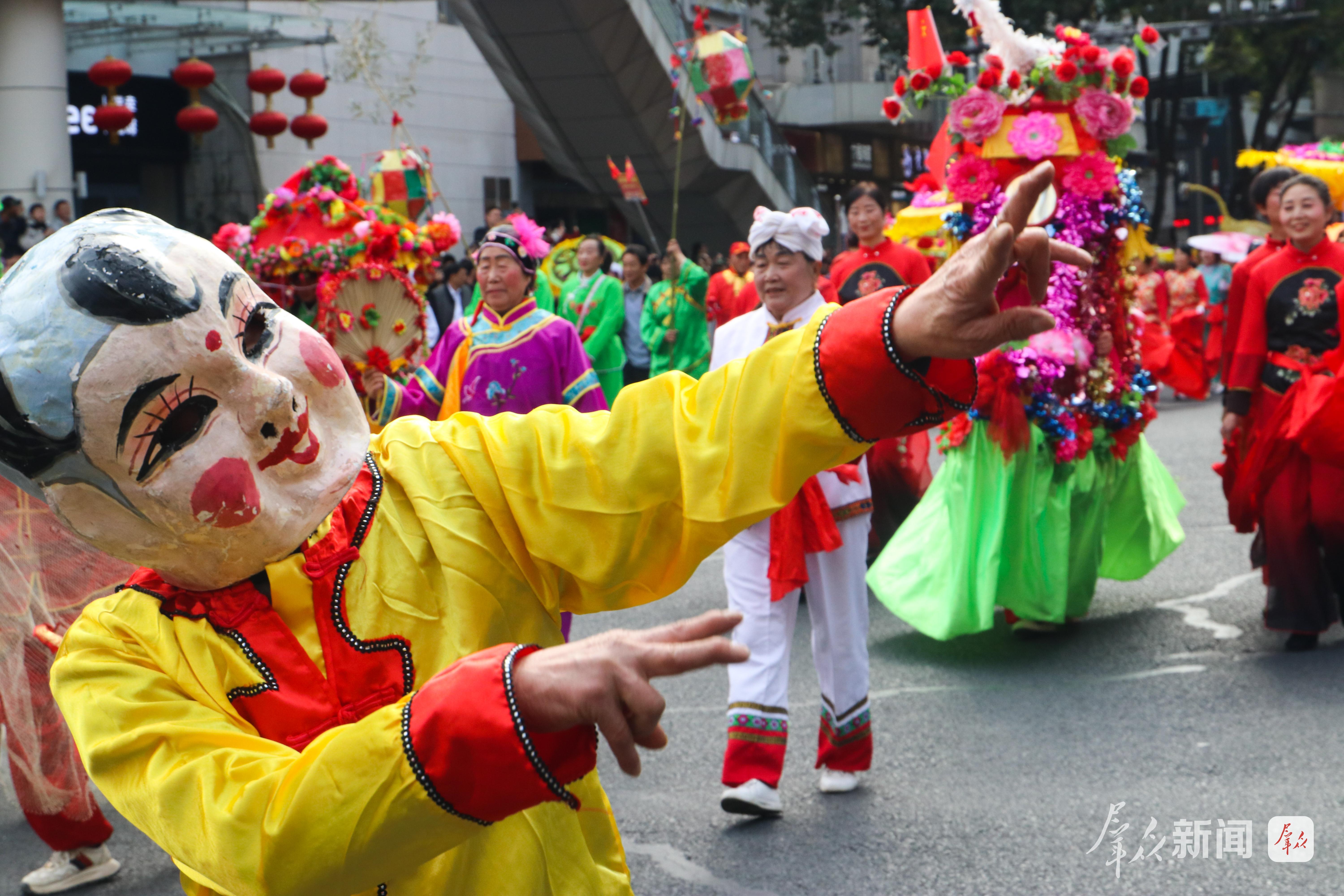 2月27日,演员在社火巡游中进行汉调二黄表演。