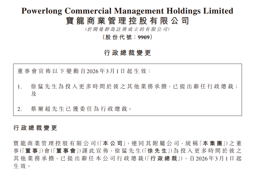 乐居财经 李兰 3月1日,宝龙商业(09909.HK)发布公告,徐猛为投入更多时间于其他业务承担,已提出辞任行政总裁,蔡尔超接任。