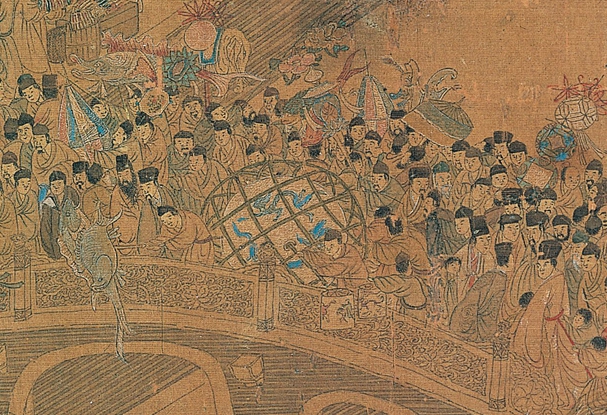 画卷左侧以三孔石桥为地理坐标,经学者杨新考据,此乃南京城南地标内桥,桥北为明代吴王府旧址。桥面摩肩接踵,百姓扶老携幼提灯过桥,代表着“走百病”的古俗——元宵夜妇女着盛装逢桥必过,祈愿祛除病灾。