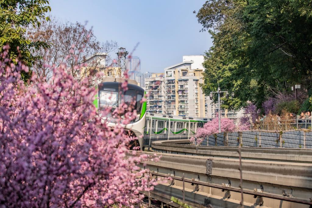 山林间,鸟鸣虫唱次第响起;长江铜锣峡畔,桃花灼灼开满两岸;轨道列车穿楼而过,带着春光,也带着山城的烟火气。