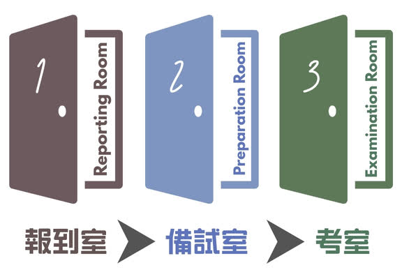 考生應先向報到室主管報到。核實身份後,主管會將考生編配至不同組別,並派發印有英文字母「A/B/C/D」的顏色貼紙及兩張記分紙(一藍一粉紅)。考生須核對記分紙上個人資料,並在指定位置簽名,同時將顏色貼紙貼於胸前以便識別,等候指示進入備試室。如有需要,應於報到時間起計30分鐘內使用洗手間;進入備試室後將不獲准前往。