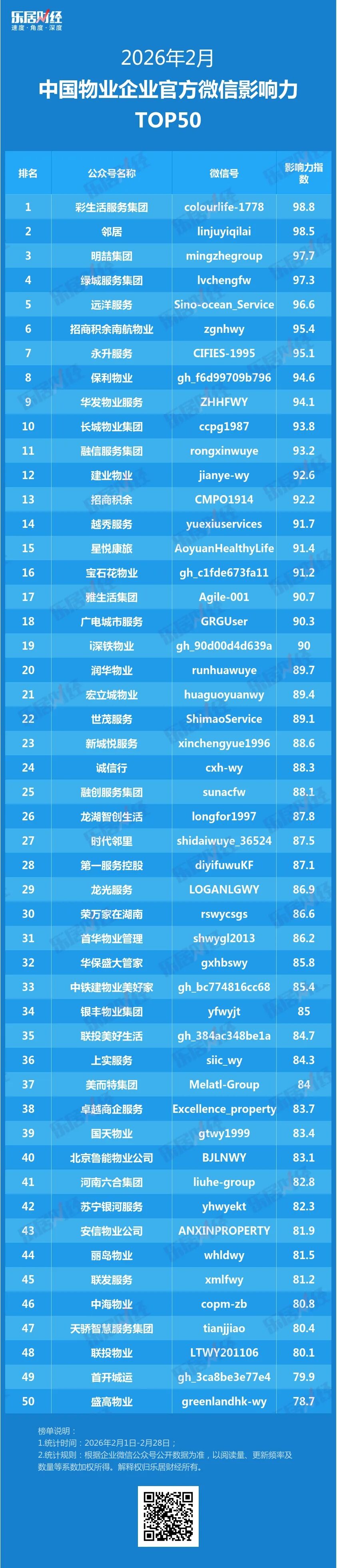 本期榜单,乐居财经共收集167家在2月份有更新的物企微信号作为样本,根据库内账号的多项公开数据,包括文章推送频次、总发文数量、总阅读量,以及单篇文章的爆文指数等系数加权得出影响力指数。