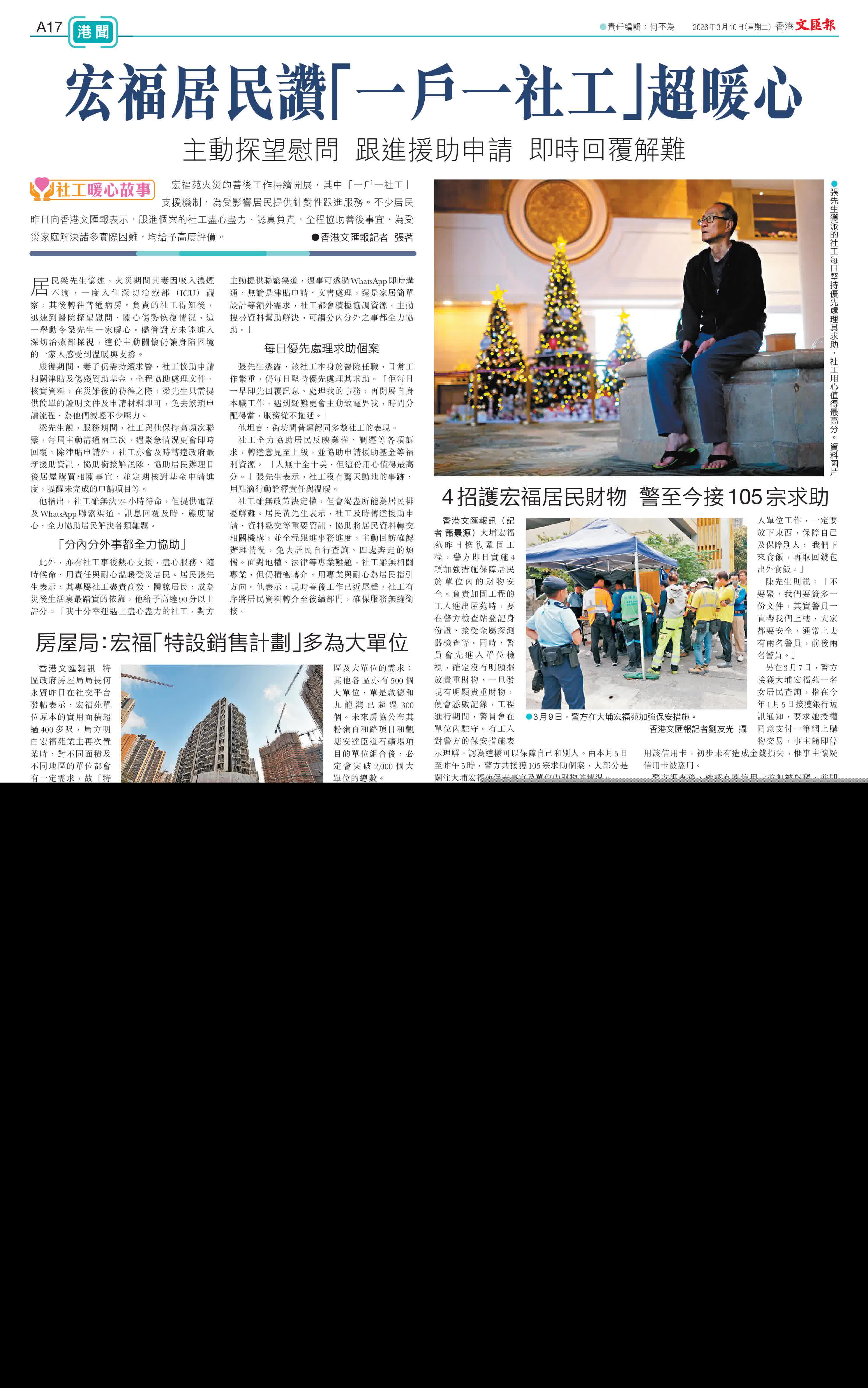 (香港文匯報記者 張茗)宏福苑火災的善後工作持續開展,其中「一戶一社工」支援機制,為受影響居民提供針對性跟進服務。不少居民昨日向香港文匯報表示,跟進個案的社工盡心盡力、認真負責,全程協助善後事宜,為受災家庭解決諸多實際困難,均給予高度評價。