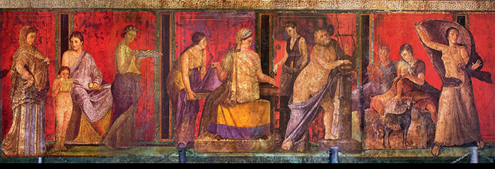 这些绘画源自庞贝的西塔拉琴师之家,这里是庞贝规模最大,最具纪念意义的住宅之一,房间墙壁绘满彩色湿壁画。庞贝时期,当时的贵族家庭会用古希腊题材的艺术来彰显自己的博学。绘画其主题往往来源于古希腊、古罗马的神话故事,庞贝的画师也大量模仿古希腊绘画手法。据传,古希腊的绘画成就不逊色于古希腊雕塑,但至今留存的古希腊绘画极为稀少,因此从保存完好的庞贝的壁画精品中也可以间接感受古希腊绘画的样貌。