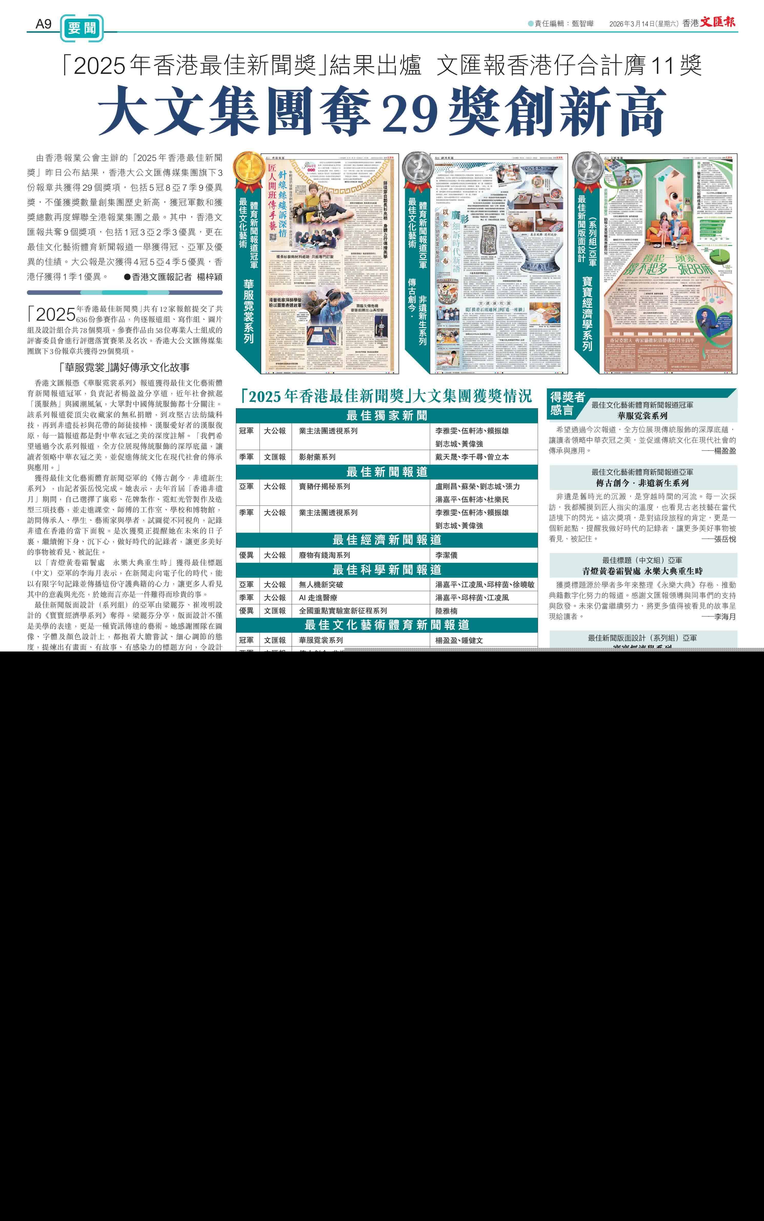 「2025年香港最佳新聞獎」共有12家報館提交了共636份參賽作品,角逐報道組、寫作組、圖片組及設計組合共78個獎項。參賽作品由58位專業人士組成的評審委員會進行評選落實賽果及名次。香港大公文匯傳媒集團旗下3份報章共獲得29個獎項。