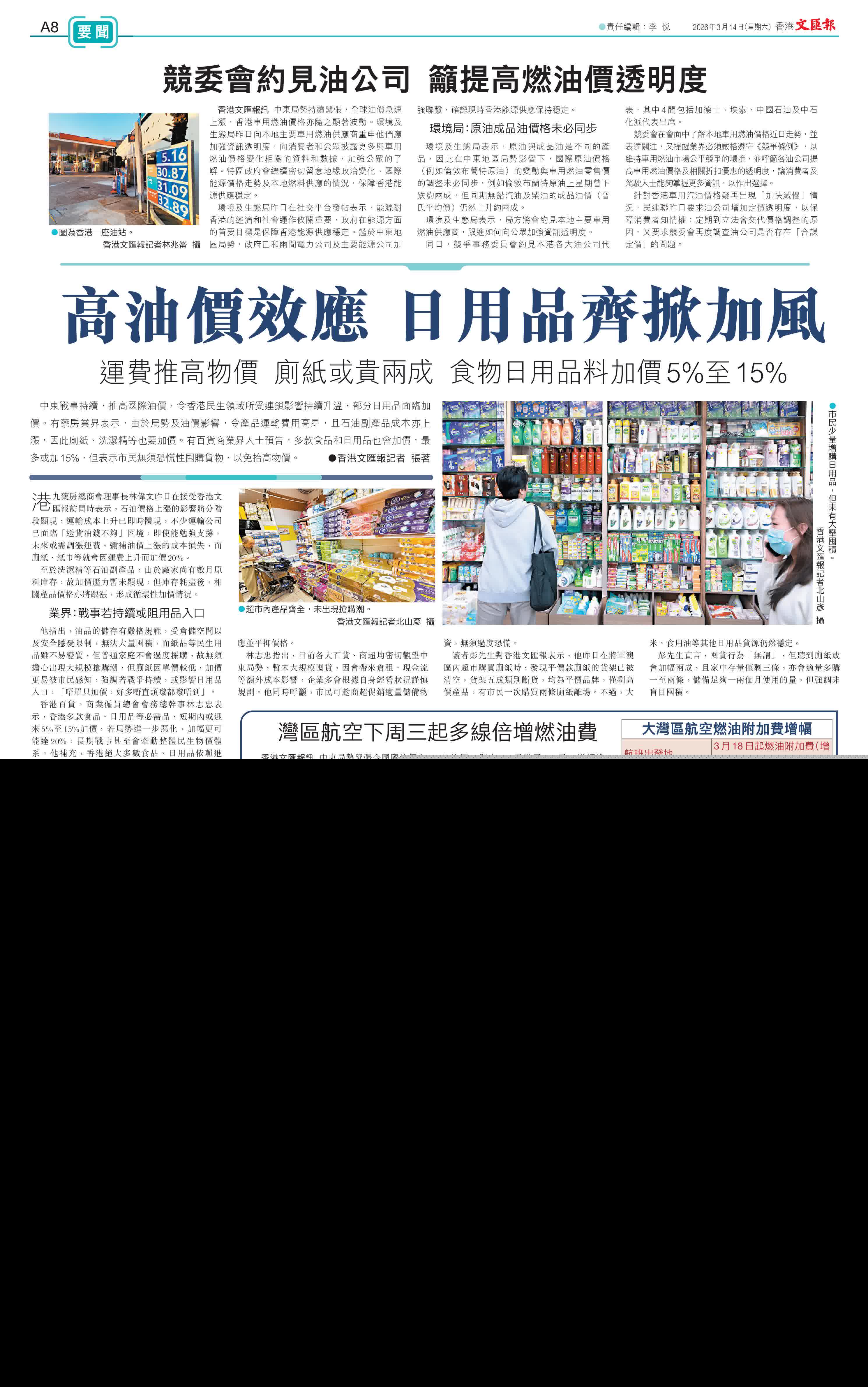 (香港文匯報記者 張茗)中東戰事持續,推高國際油價,令香港民生領域所受連鎖影響持續升溫,部分日用品面臨加價。有藥房業界表示,由於局勢及油價影響,令產品運輸費用高昂,且石油副產品成本亦上漲,因此廁紙、洗潔精等也要加價。有百貨商業界人士預告,多款食品和日用品也會加價,最多或加15%,但表示市民無須恐慌性囤購貨物,以免抬高物價。