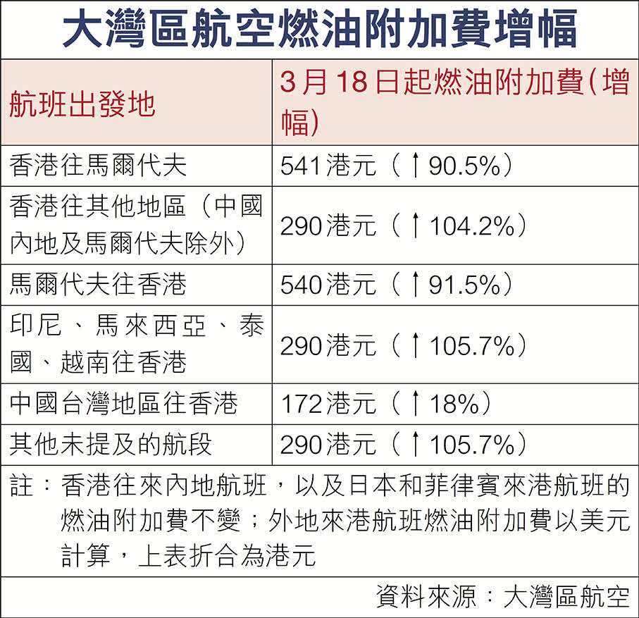 大灣區航空由香港出發前往馬爾代夫的燃油附加費,由284元增至541元,加幅達九成;而由香港出發至其他地區,則由142元增至290元,增幅逾一倍。至於印尼、馬來西亞、泰國、越南往香港的航班,燃油附加費由18美元(折合141港元)增至37美元(折合290港元),增幅同樣超過一倍。往來香港與內地的航班165港元的燃油附加費則維持不變(見表)。
