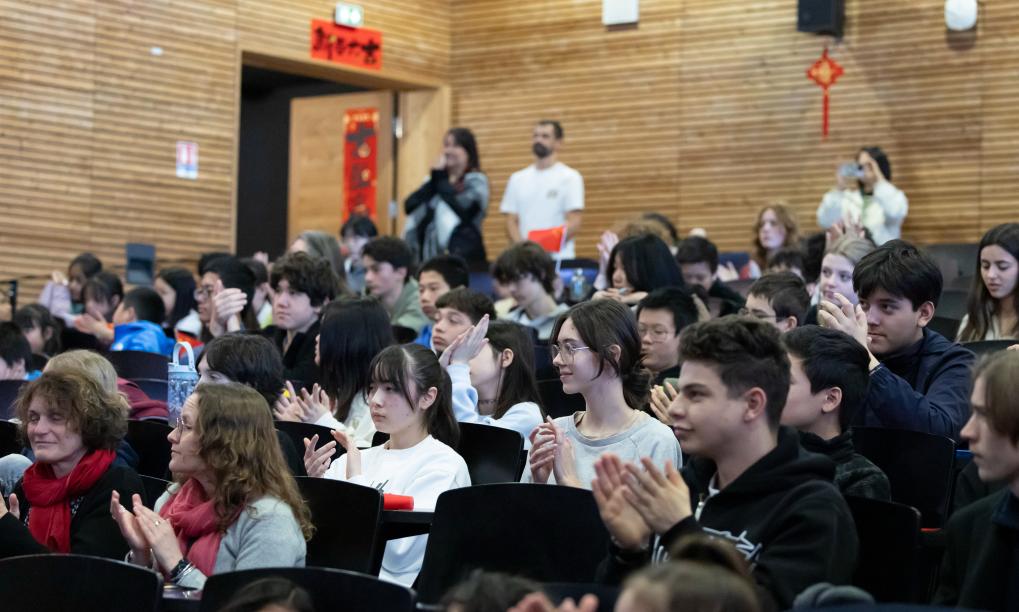 当地时间3月12日,普罗旺斯小城马诺斯克,春日和煦。学校的阶梯教室里,红灯笼和中国结高高挂起,中国驻马赛总领馆向学校转交习近平主席复信,现场气氛热烈,在座师生们鼓掌、欢呼,脸上洋溢着兴奋的笑容。