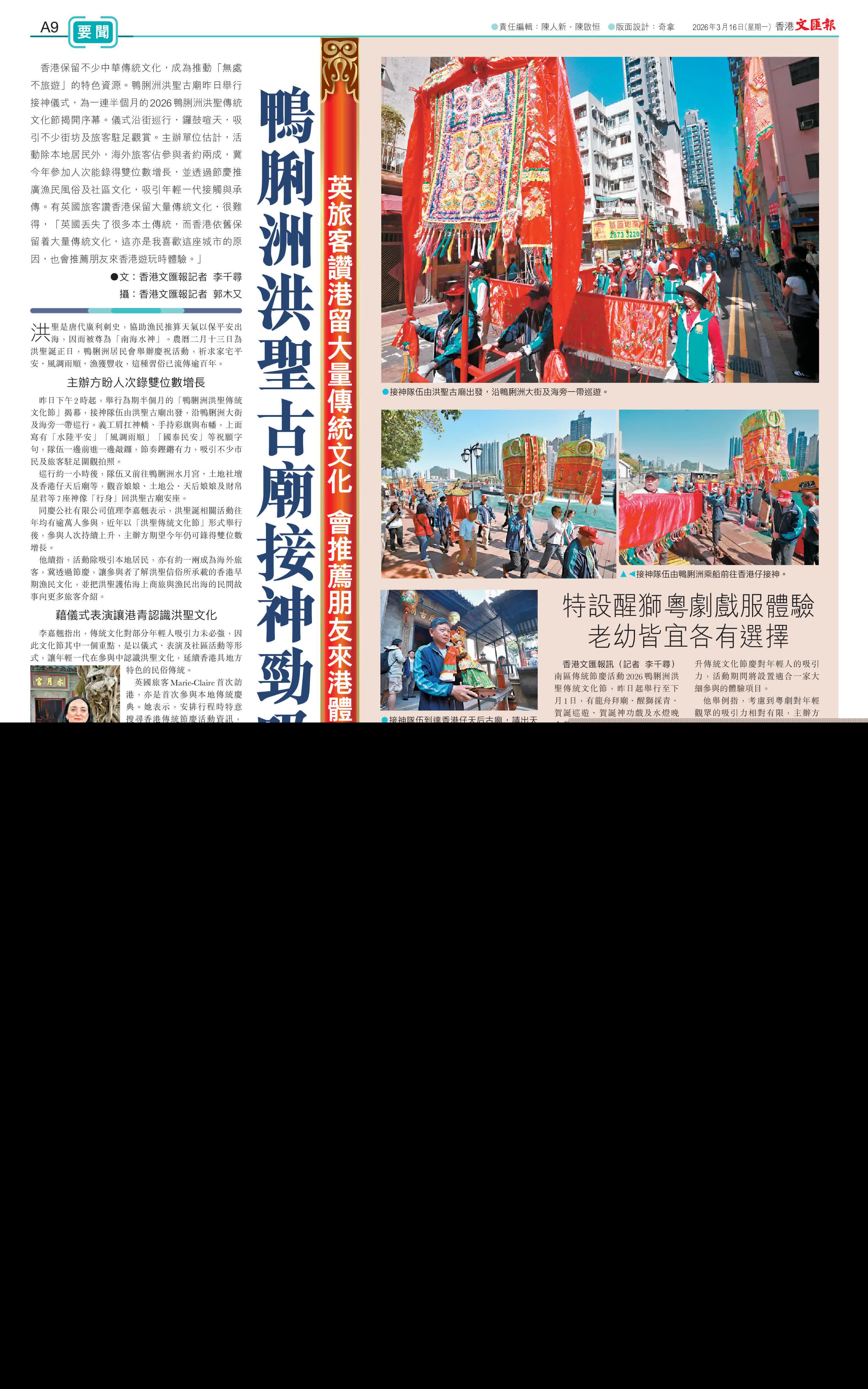 (香港文匯報記者 李千尋)香港保留不少中華傳統文化,成為推動「無處不旅遊」的特色資源。鴨脷洲洪聖古廟昨日舉行接神儀式,為一連半個月的2026鴨脷洲洪聖傳統文化節揭開序幕。儀式沿街巡行,鑼鼓喧天,吸引不少街坊及旅客駐足觀賞。主辦單位估計,活動除本地居民外,海外旅客佔參與者約兩成,冀今年參加人次能錄得雙位數增長,並透過節慶推廣漁民風俗及社區文化,吸引年輕一代接觸與承傳。有英國旅客讚香港保留大量傳統文化,很難得,「英國丟失了很多本土傳統,而香港依舊保留着大量傳統文化,這亦是我喜歡這座城市的原因,也會推薦朋友來香港遊玩時體驗。」