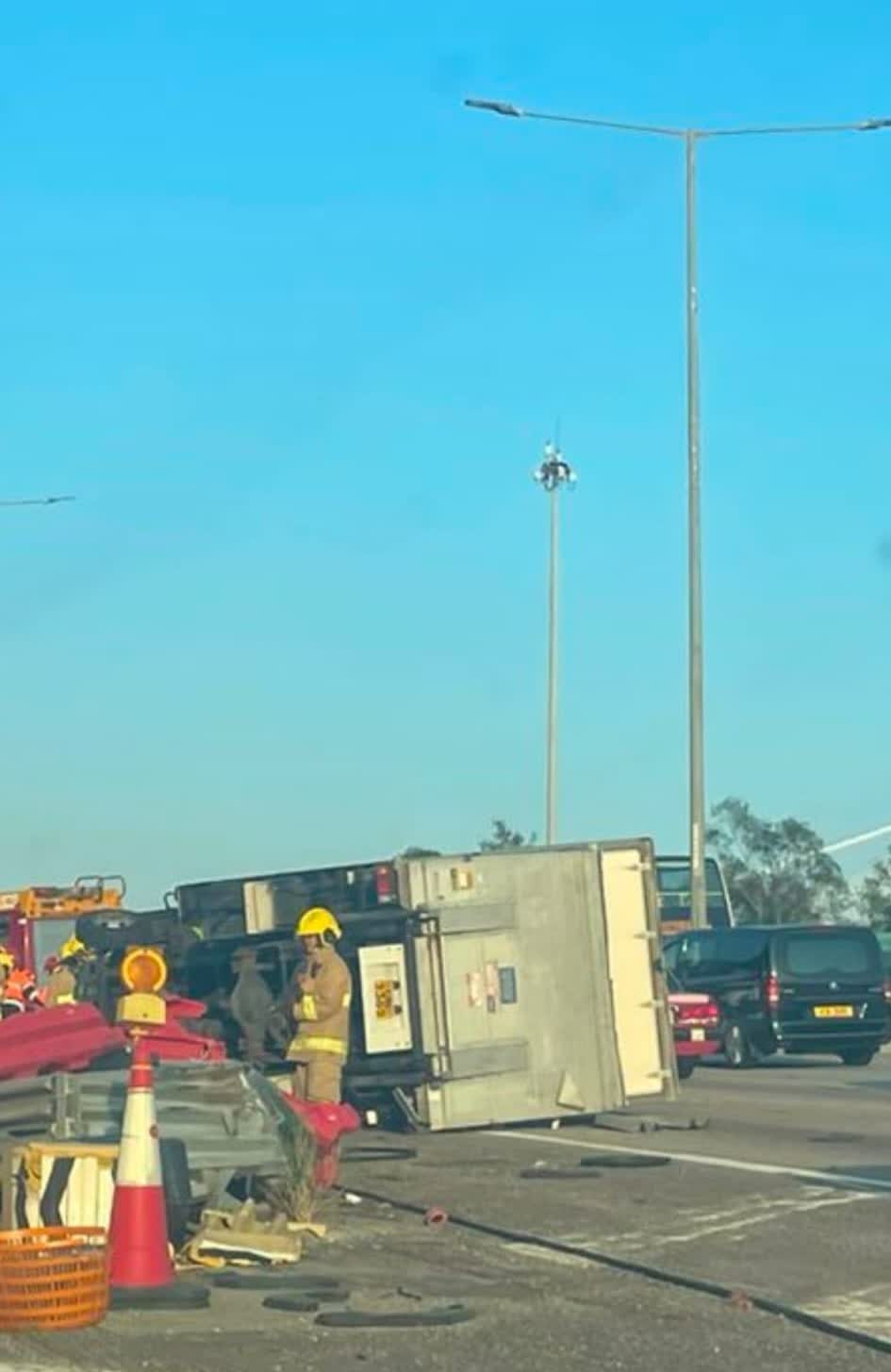 香港文匯報訊(記者 蕭景源)屯門公路往九龍方向近汀九,今日(16日)下午5時許,一輛貨車沿屯門公路往九龍方向行駛,當駛至近汀九時,司機懷疑收掣不及,貨車撞向分岔路中的風琴式防撞欄繼而全車翻側。