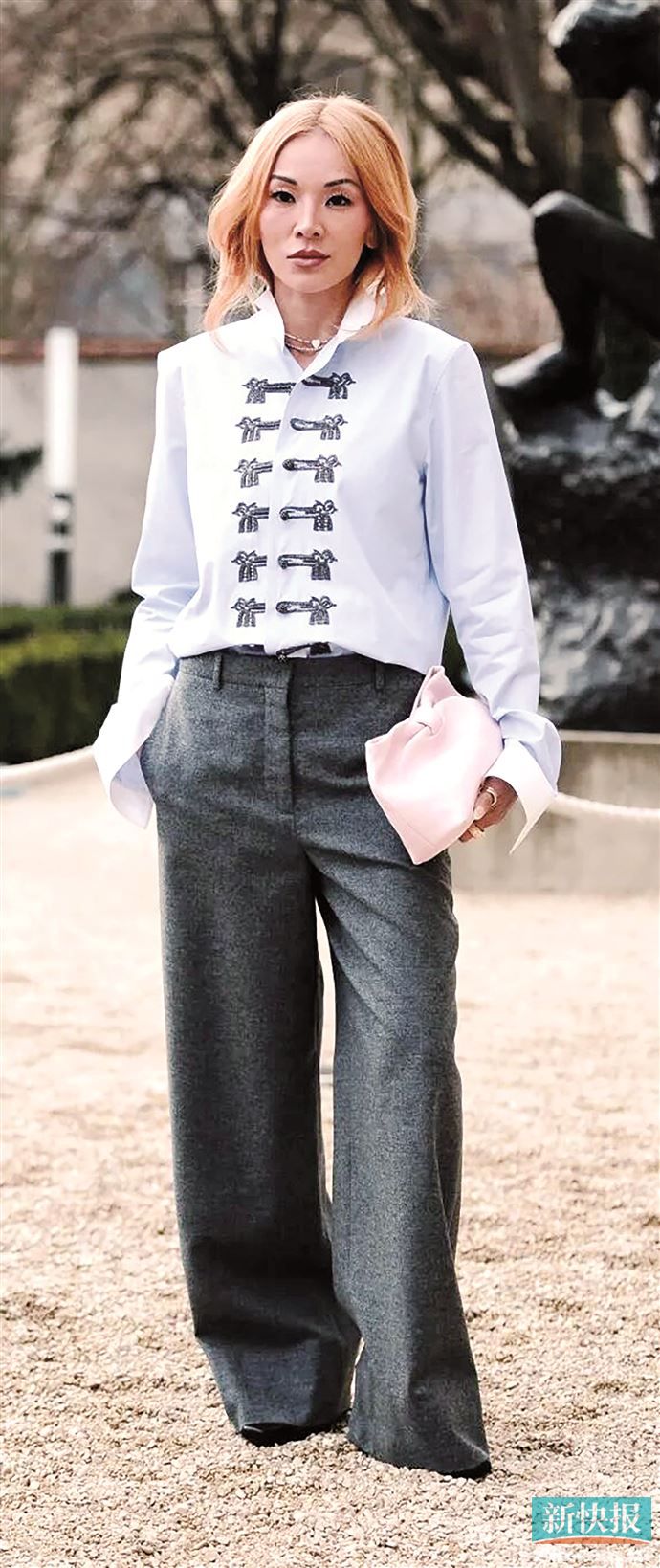 在Chinamaxxing的潮流演绎中,盘扣外套成为日常穿搭的“万能单品”,随手搭西裤或牛仔裤,就能穿出带着中式气韵的松弛与质感。搭半身裙则瞬间切换成“温柔中带克制的东方美感”,直接将其作为内搭,外套西装或大衣,露出立领与盘扣细节,显得既含蓄又点睛。