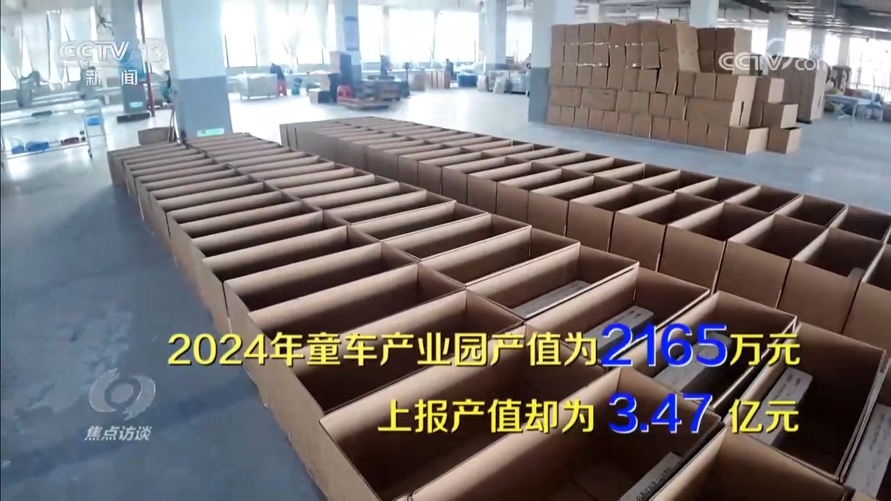 记者实地探访发现,所谓的“童车产业园”并不生产童车。比企业数量夸大更严重的是产值注水:2024年产业园实际产值为2165万元,上报产值却高达3.47亿元。