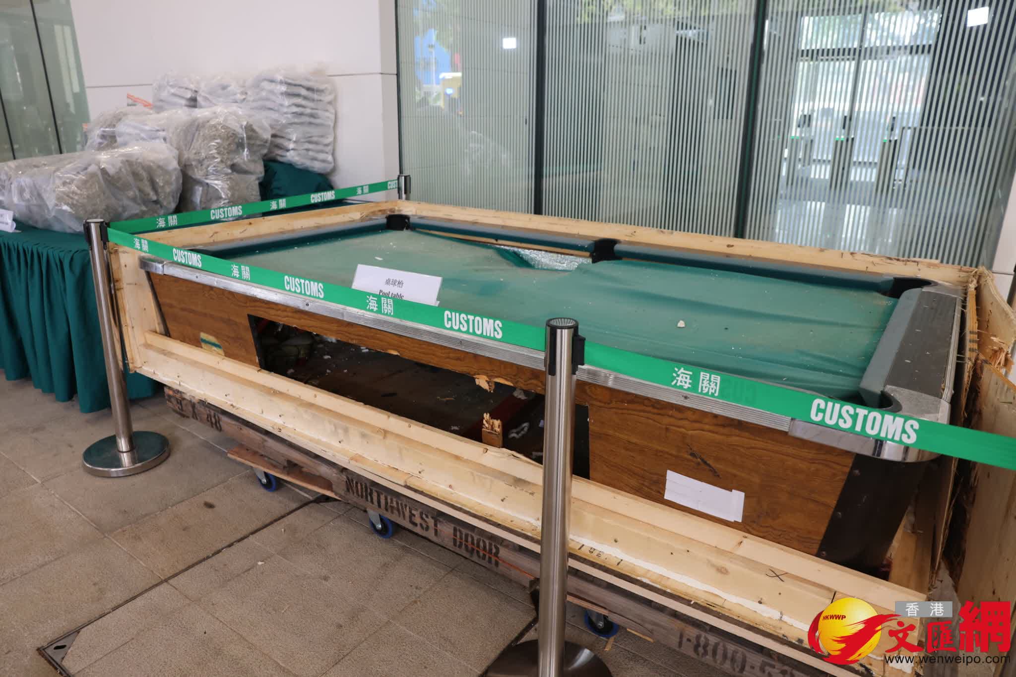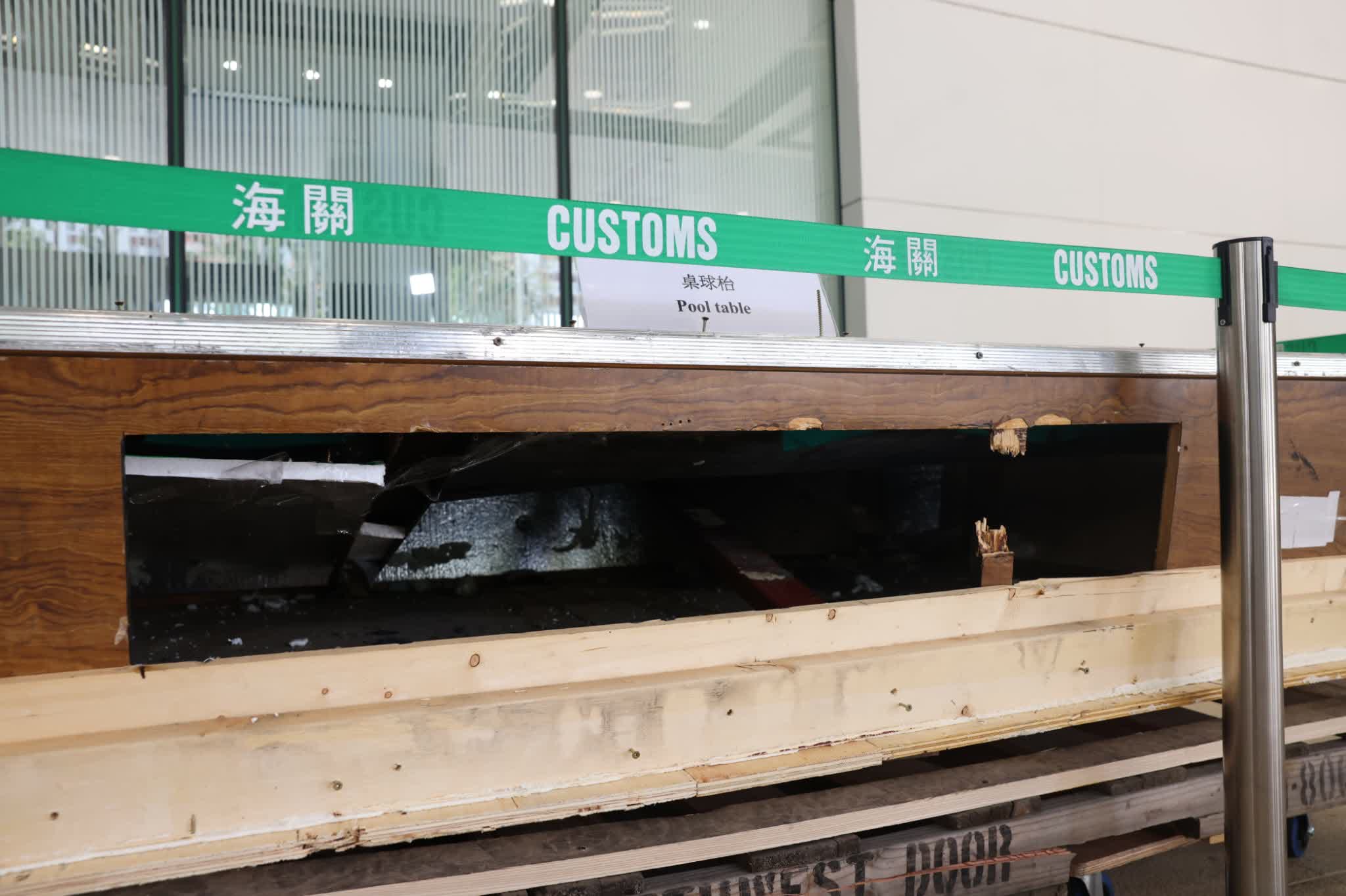直至本月10日關員打開貨櫃詳細檢查,發現桌球檯外觀及表面相對殘舊,桌球檯的兩端及兩側袋口位置更用木板封閉,關員思疑利用細微內窥顯示鏡頭伸入桌球檯與木板之間檢查,發現桌球檯內部被挖空收藏多包異物,經破開桌球檯發現內層藏有143包共重約106公斤大麻花毒品,市值約2200萬港元;案件交由海關毒品調查科跟進,鎖定九龍灣一間物流公司其為批貨物收貨人,而該公司是受加拿大一名客戶委託運送該批貨物。