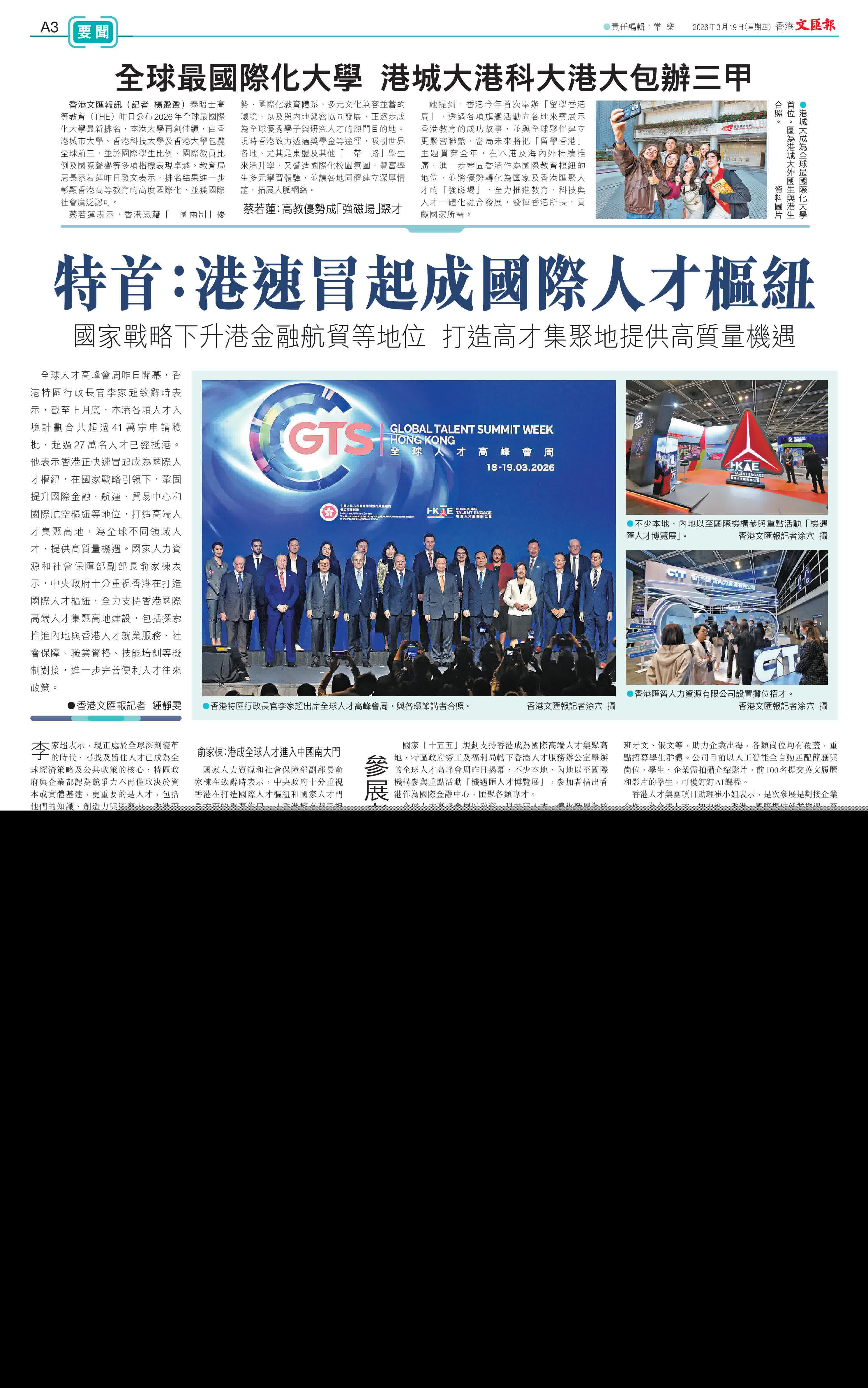全球人才高峰會周以教育、科技與人才一體化發展為核心,昨日起一連兩日舉行「國際人才論壇」及「機遇匯人才博覽展」,直至本月29日期間,將聯同海內外合作夥伴舉辦9項衛星活動,聚焦教育、科技與人才一體化發展,突顯香港作為國際人才樞紐及國家人才門戶的角色與優勢。