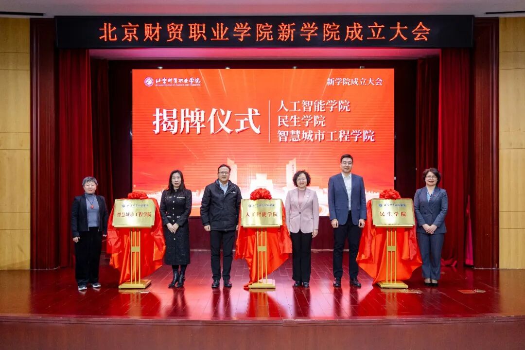 3月18日,北京财贸职业学院举办新学院成立大会,人工智能学院、民生学院、智慧城市工程学院揭牌成立。