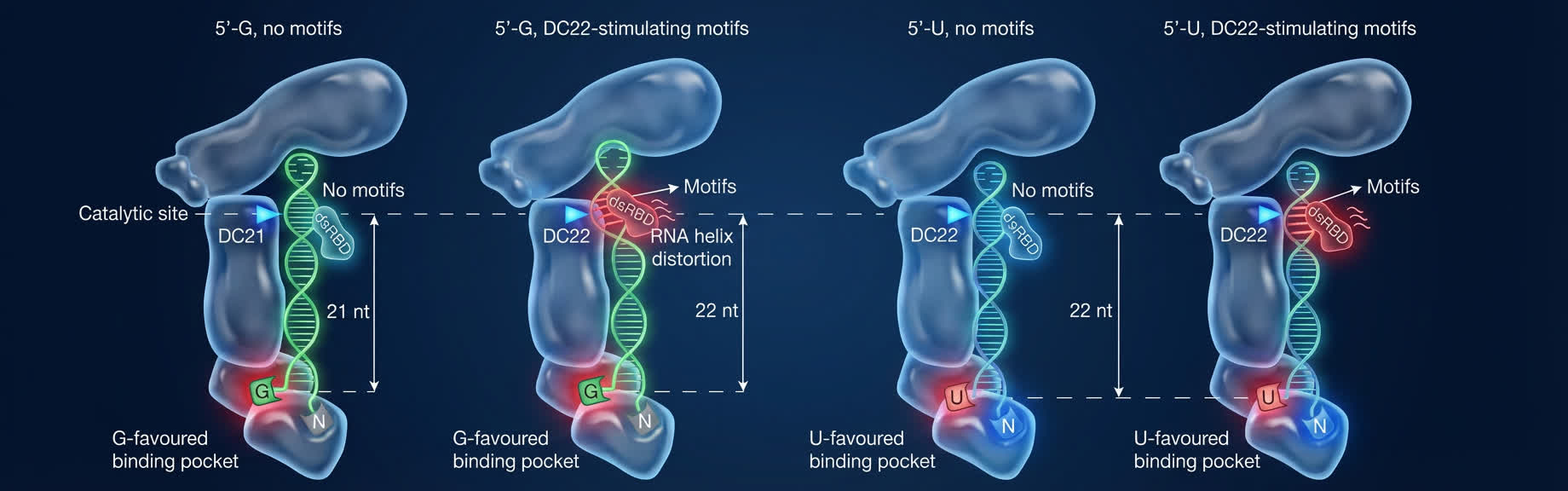 研究更首次發現,除已知偏好辨識尿嘧啶(U‑favoured)的5′端結合口袋外,DICER還具有一個全新的、偏好辨識鳥嘌呤(G‑favoured)的5′端結合口袋。兩者共同構成「雙口袋機制」,決定DICER在不同位置進行切割,為闡釋DICER如何適配並切割不同RNA序列提供了全新的理論依據。
