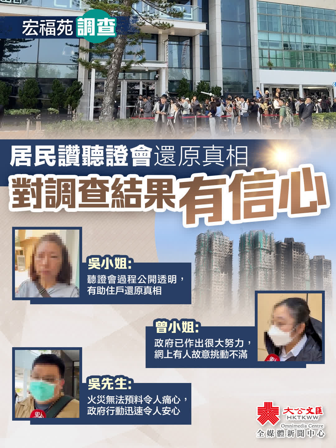 宏福苑居民吳小姐形容,由政府成立的獨立委員會舉辦的首場聽證會過程公開透明,有助住戶進一步了解大火的來龍去脈,還原真相,尤其是當中有部分證據令人印象深刻。儘管發生不幸事件,但感謝政府盡了最大的努力,例如,即時安排過渡性房屋和社區中心等地安置,「一戶一社工」有效減少行政程序,避免住戶到處「頻撲」。