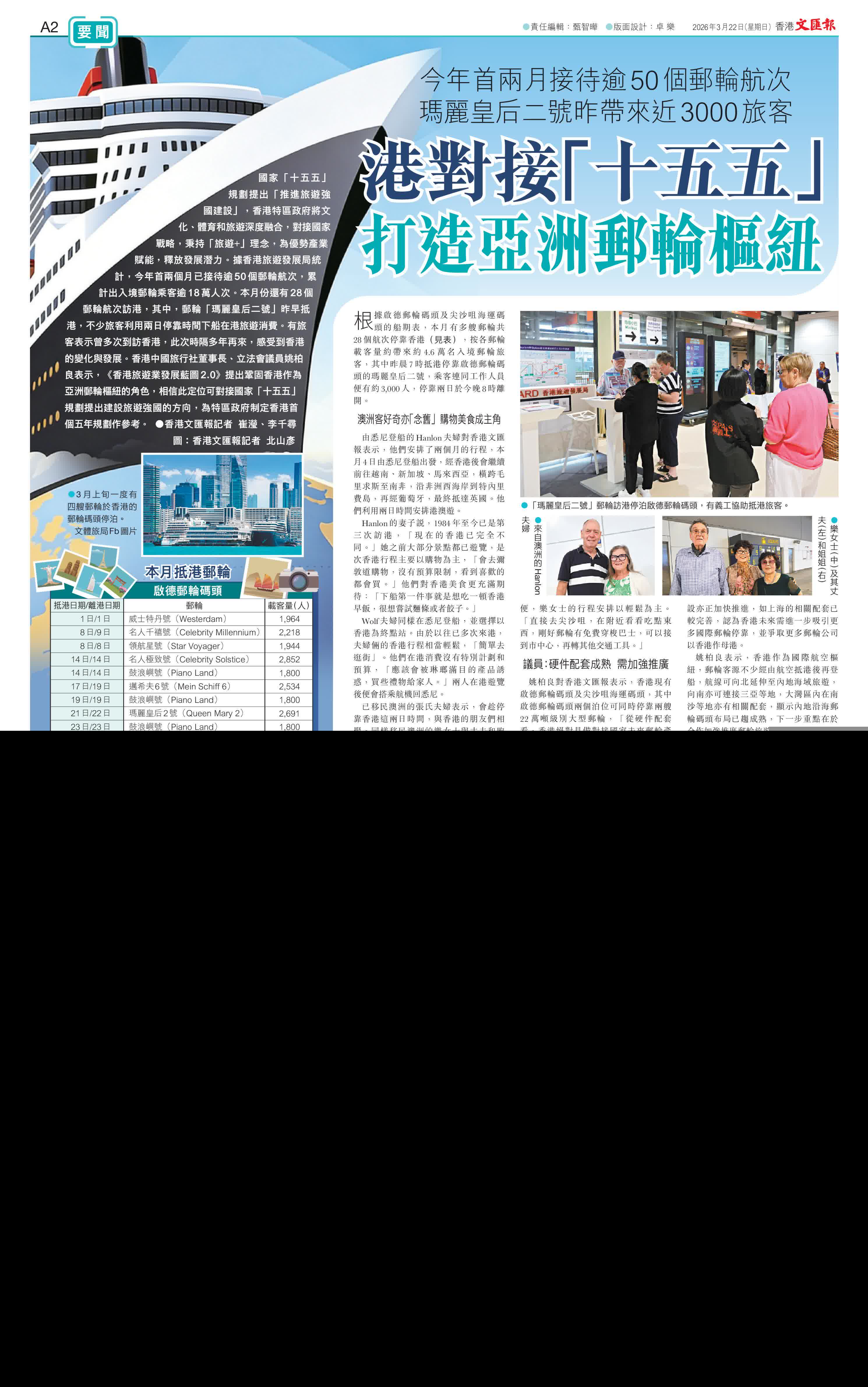 (香港文匯報記者 崔瀅、李千尋)國家「十五五」規劃提出「推進旅遊強國建設」,香港特區政府將文化、體育和旅遊深度融合,對接國家戰略,秉持「旅遊+」理念,為優勢產業賦能,釋放發展潛力。據香港旅遊發展局統計,今年首兩個月已接待逾50個郵輪航次,累計出入境郵輪乘客逾18萬人次。本月份還有28個郵輪航次訪港,其中,郵輪「瑪麗皇后二號」昨早抵港,不少旅客利用兩日停靠時間下船在港旅遊消費。有旅客表示曾多次到訪香港,此次時隔多年再來,感受到香港的變化與發展。香港中國旅行社董事長、立法會議員姚柏良表示,《香港旅遊業發展藍圖2.0》提出鞏固香港作為亞洲郵輪樞紐的角色,相信此定位可對接國家「十五五」規劃提出建設旅遊強國的方向,為特區政府制定香港首個五年規劃作參考。