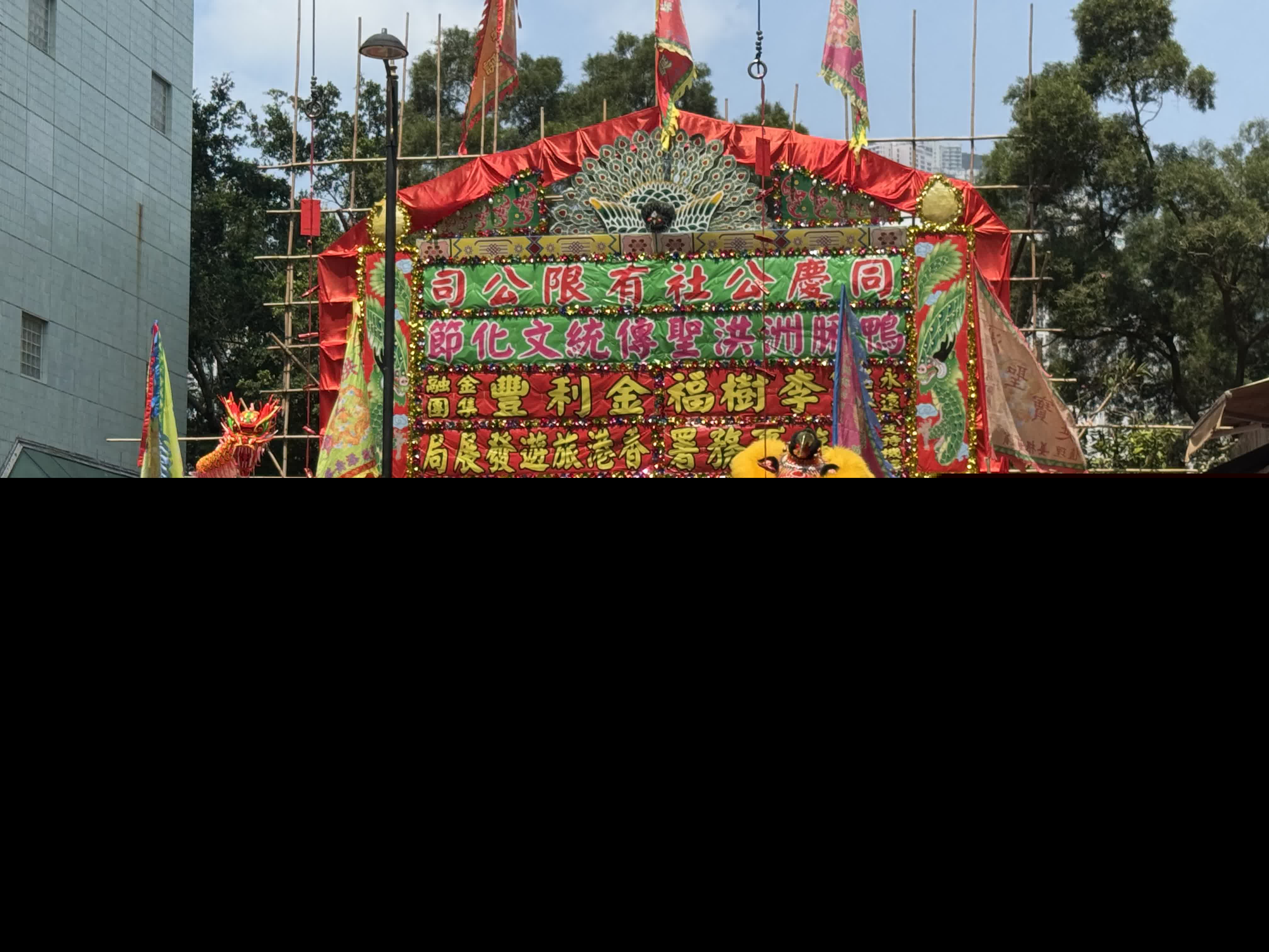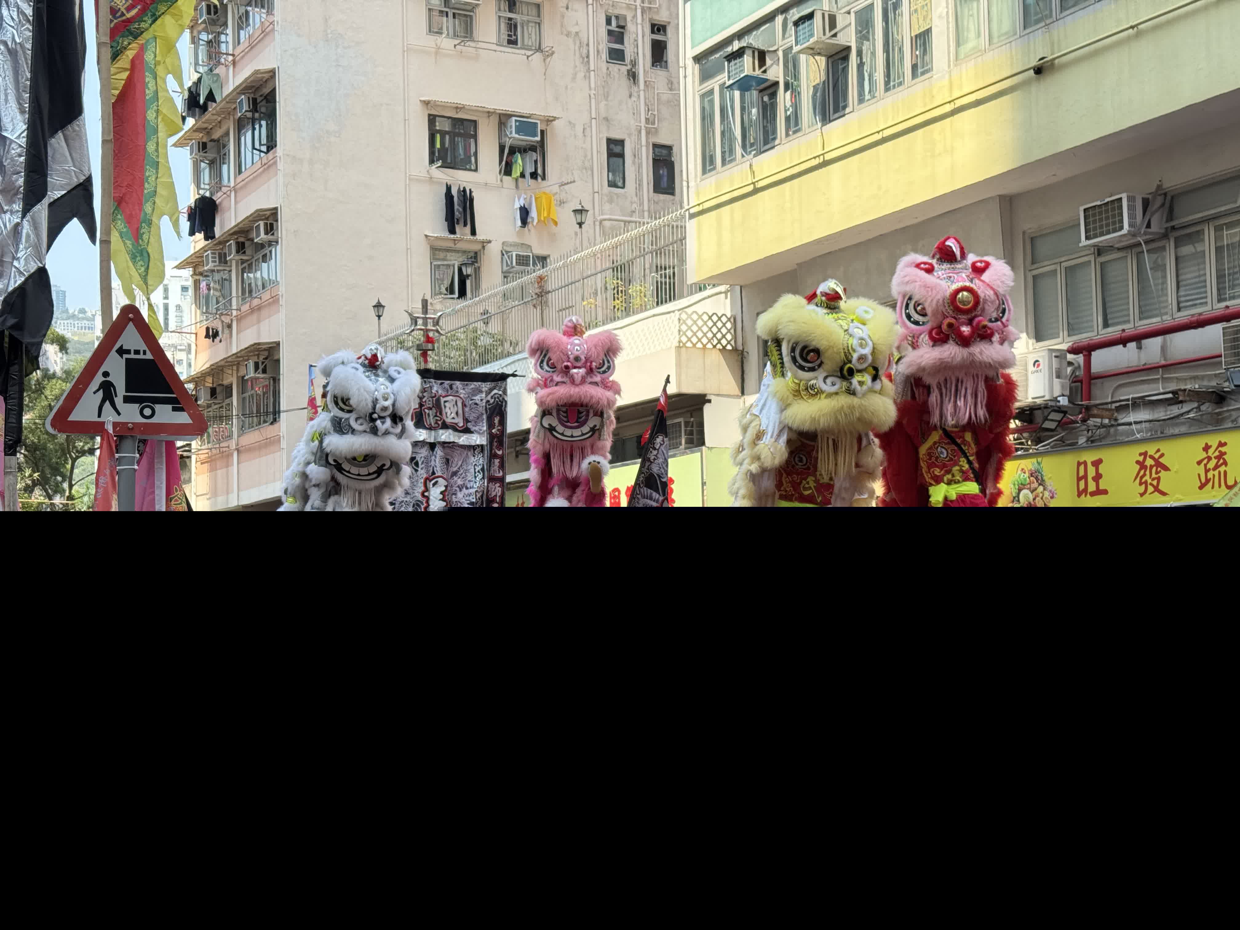 現場上演醒獅採青,各種顏色、裝飾各異的獅子搖頭擺尾,生動活潑,時而匍匐在地,時而揚起前腿四處眺望,尋找並摘下生菜,亦諧音「生財」,寓意招財進寶、生機勃勃。