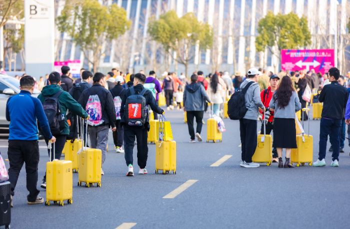领物结束后,这道“小黄箱风景线”从博览中心延伸至整座城市——地铁、高铁、机场……满眼都是拖着黄色拉杆箱的跑者,网友纷纷晒出“满城尽是小黄箱”的壮观一幕。
