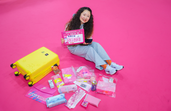 为了迎接这场奔跑盛宴,海澜之家在赛前就为跑者们送上一份沉甸甸的“能量”。领物现场特别打造成“登机口”设计,寓意一飞冲天与新的启航。海澜之家能量包内有小奶狗T恤、全顶遮阳帽、防晒冰袖、加厚毛巾底袜、亲肤绵柔巾、艾草按摩捶等实用物品,从赛道防护到赛后恢复一应俱全。20寸黄色定制拉杆箱可将所有物资轻松收纳,让跑者在报到时就感受到“拎不完的幸福”。