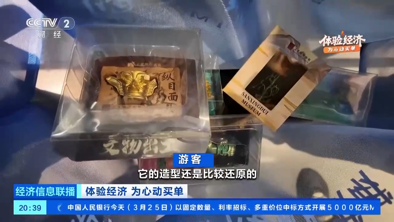 总台央视记者 吴佳灵:在四川德阳的三星堆博物馆,从青铜大立人到青铜神树,这里的文物,凭借神秘感,吸引着源源不断的游客。而它们的形象,也被做成了冰箱贴、毛绒玩具等文创产品,成了很多游客在离开博物馆之前专门想要带走的一份“三星堆记忆”。