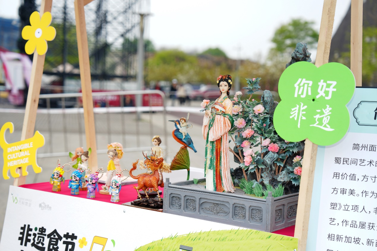 除了围桌宴饮,现场的非遗打卡墙、手作体验区、趣味游戏区,也成了万科物业业主,尤其是孩子们流连忘返的乐园。戏曲点翠、简州面塑、青神竹编等非遗项目,让“趣创作”有了更深厚的文化底蕴。投壶、捶丸等传统游戏区排起长队,欢声笑语不断。