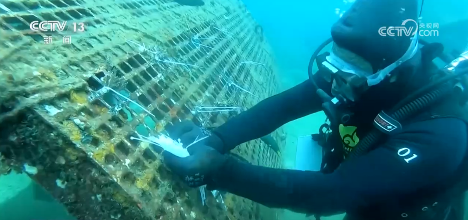 一路下潜,即将进行珊瑚种植的铁架苗圃出现在眼前。在工作人员的指导下,手中的珊瑚断肢被小心固定在苗圃上。经过一段时间的培育,这些珊瑚“种子”会移植到海底。三亚蜈支洲岛珊瑚养殖负责人王丰国介绍,珊瑚种植的目的其实就是通过人工干预恢复海洋水下生态的平衡。