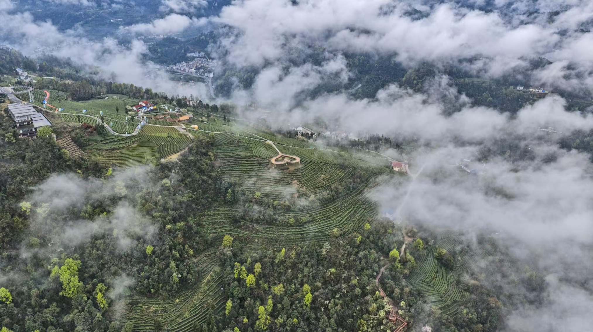云雾缭绕的湖北五峰茶园。