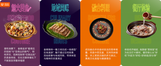 烟火美食:理性消费的风潮下,食客越发追求“看得到的现制”与“尝得出的锅气”,钟爱明档烹饪、现烤现制等“仅限此刻”的烟火美食。在社交媒体的加持下,烟火美食持续激活社交多巴胺和用餐幸福感,是当下最热的餐饮风向。