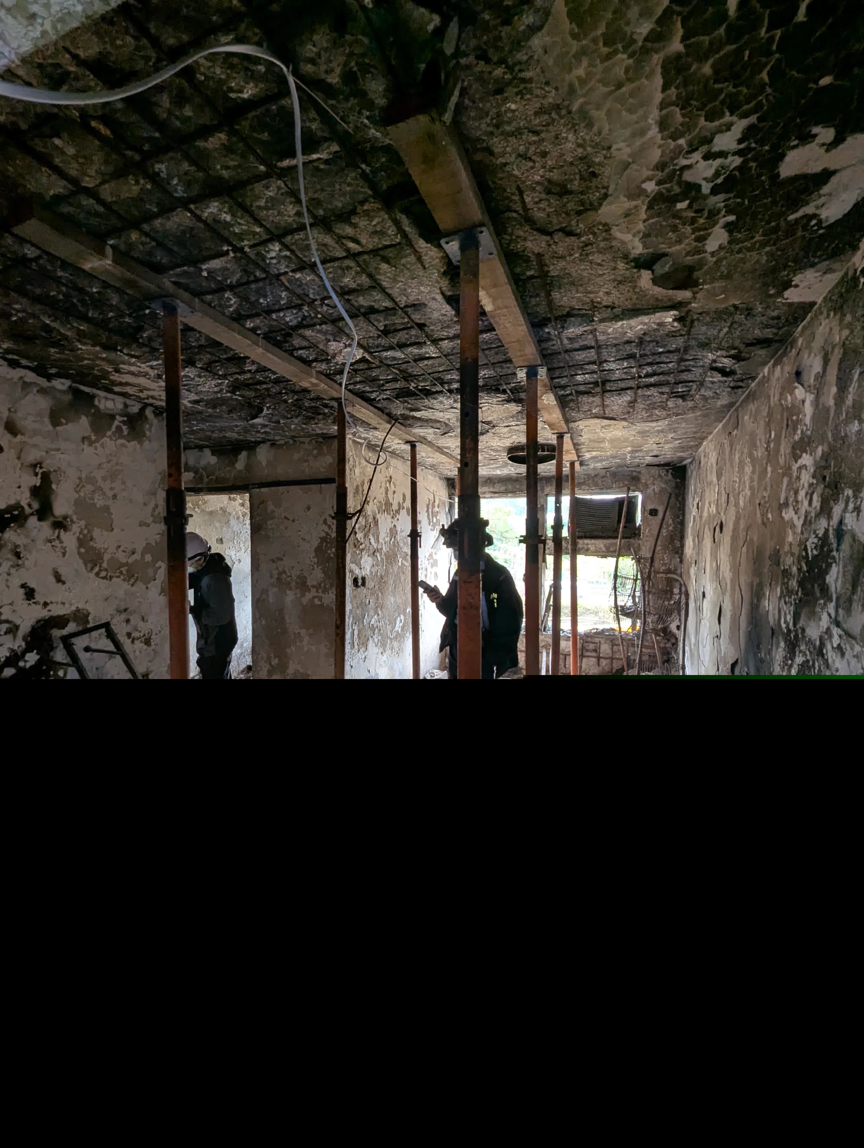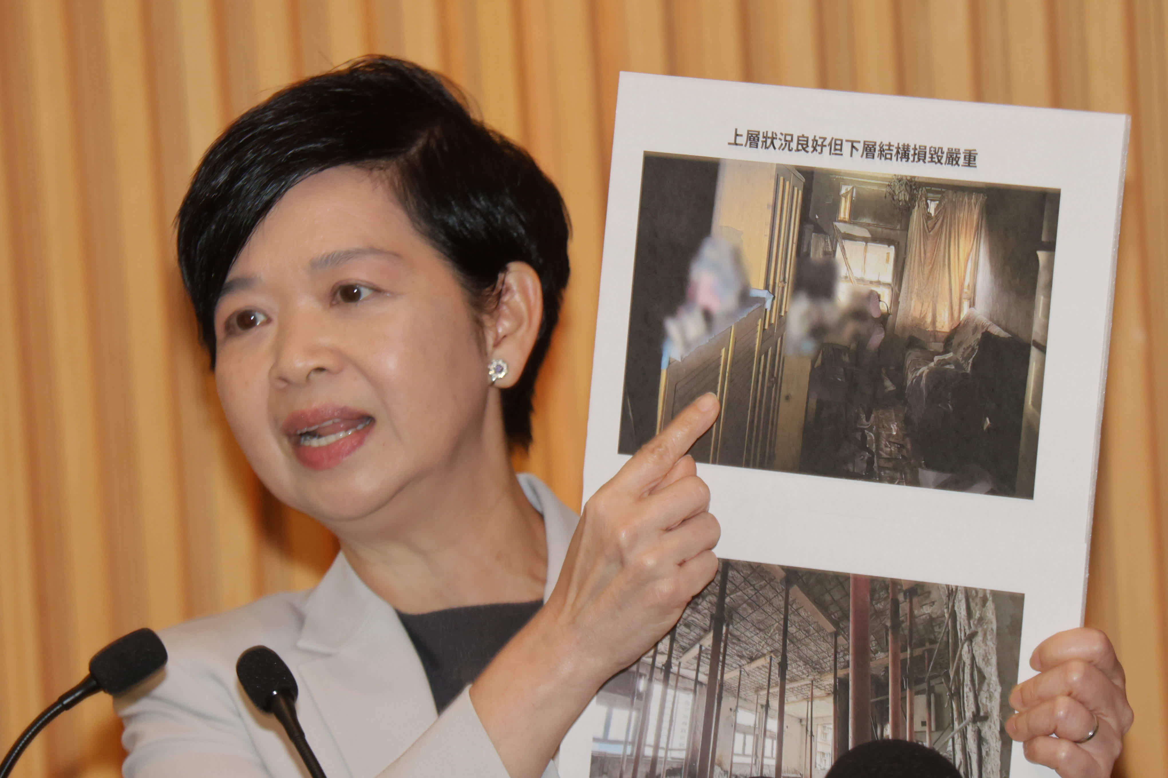 工程團隊已做過詳細評估,單位的狀況分成三種,特別是有十七組單位的情況,其上面的單位可見到傢俱、窗簾,甚至有些物品,好像沒有受火波及,仍然放置於單位內,但這個單位下面一層的單位損毀得非常非常嚴重,可見天花所有石屎已經掉下來,只剩下一些鋼筋,樓上單位地面板的承托力完全受到影響。