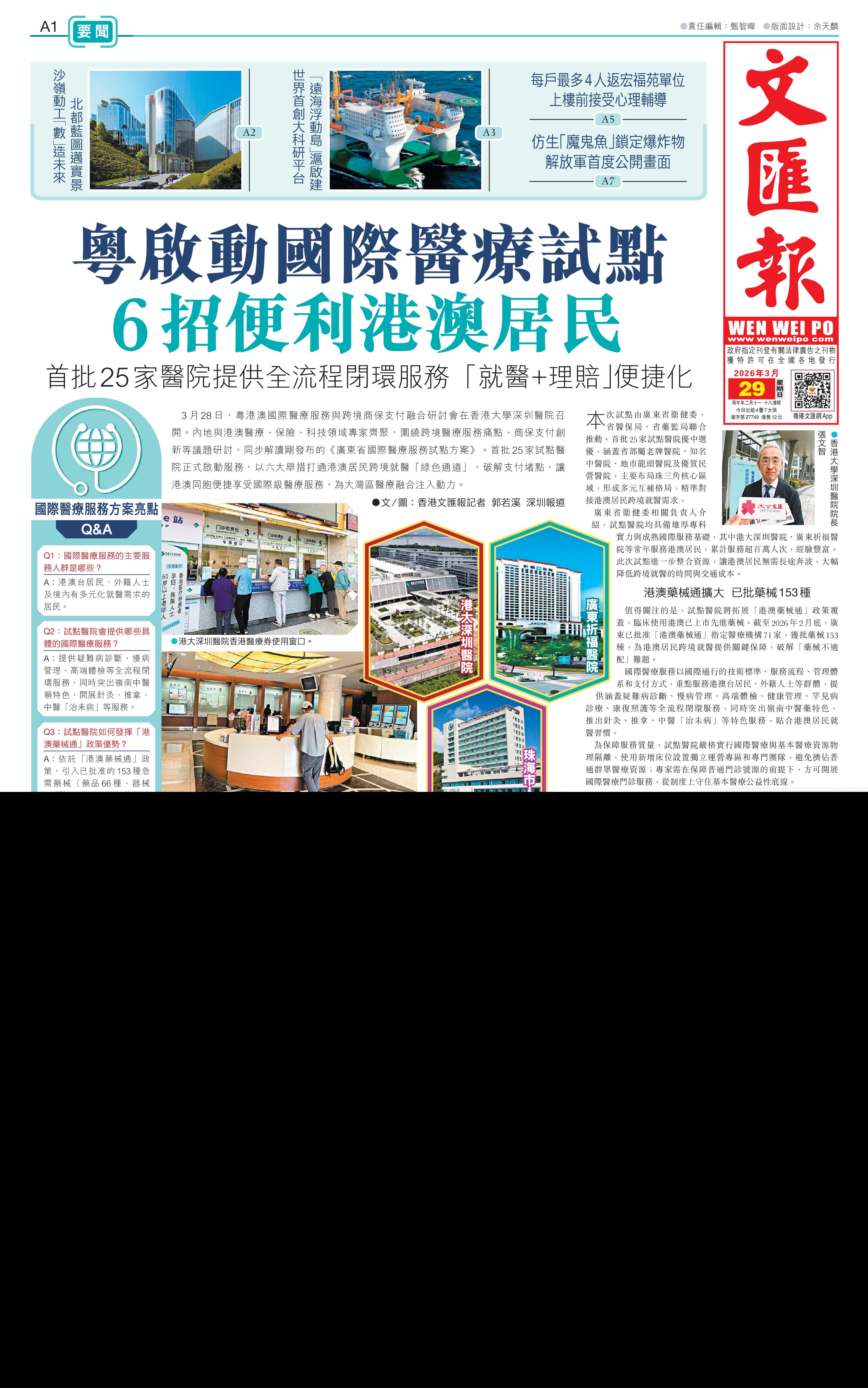 此外,試點醫院還依託粵港澳大灣區優勢,開發「醫療+保險+旅遊」服務產品,推動國際醫療服務打包付費等創新支付模式落地,進一步豐富港澳居民就醫選擇,提升跨境醫療服務的便捷度與舒適度。