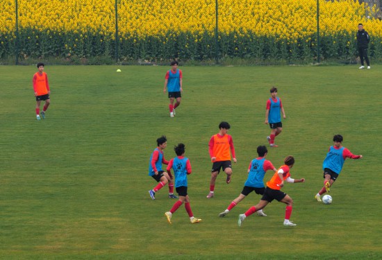训练基地位于安徽省合肥市肥西县丰乐镇,进入基地,要经过大片正在盛开的油菜花,春天的气息扑面而来。这个地处乡野的足球青训基地,经历过寒冬之后,也正在迎来自己的春天。