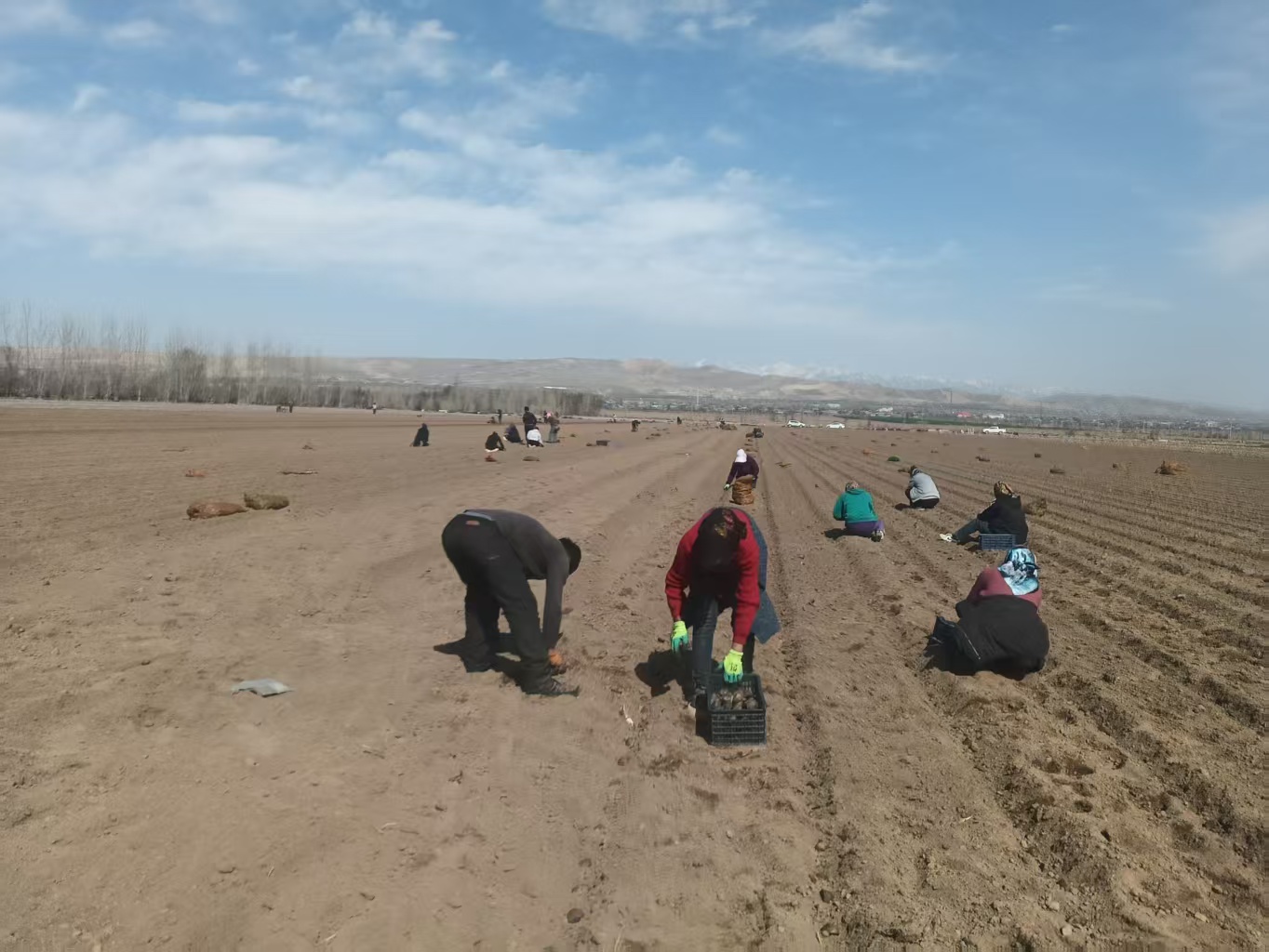 3月28日,新疆伊宁市克伯克于孜乡园艺村,村民正在用切块点种土豆。