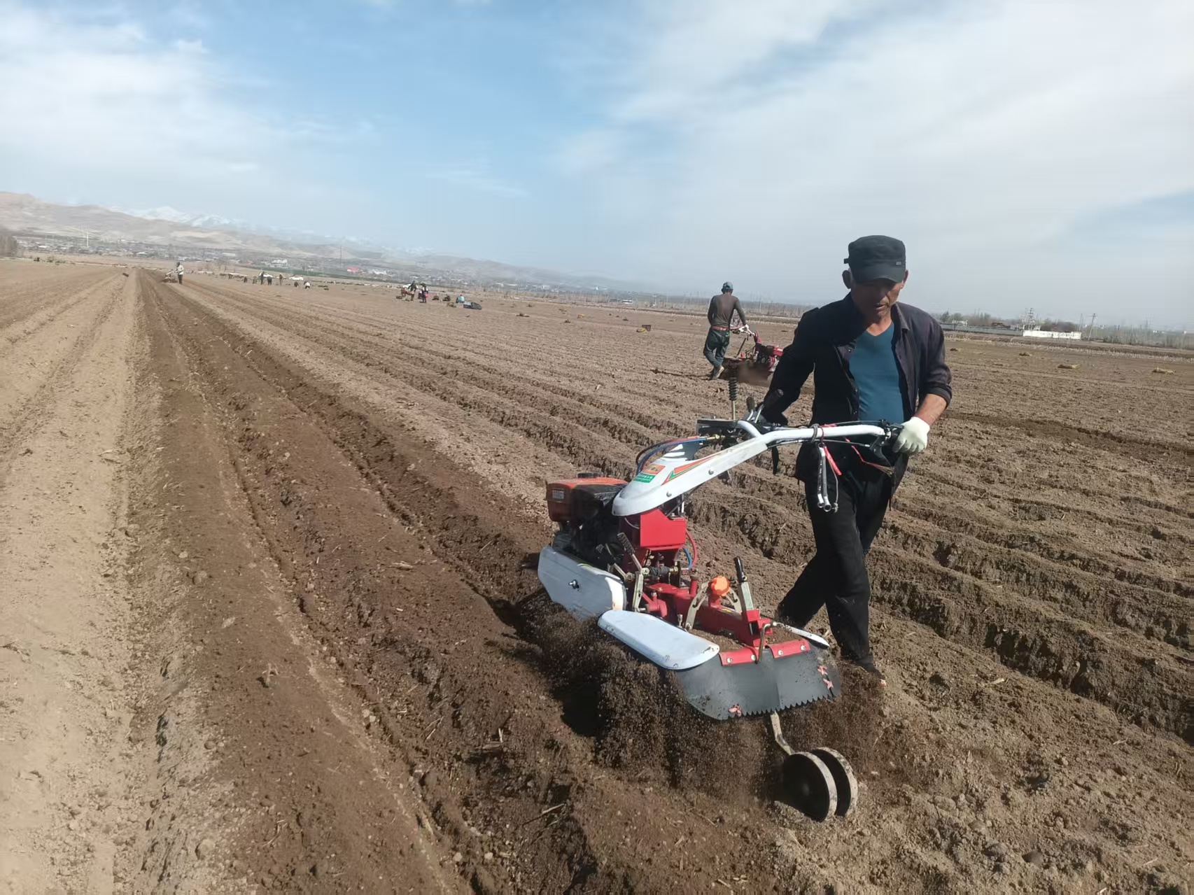 3月28日,新疆伊宁市克伯克于孜乡园艺村,村民正用机械给点种后的土豆覆土。